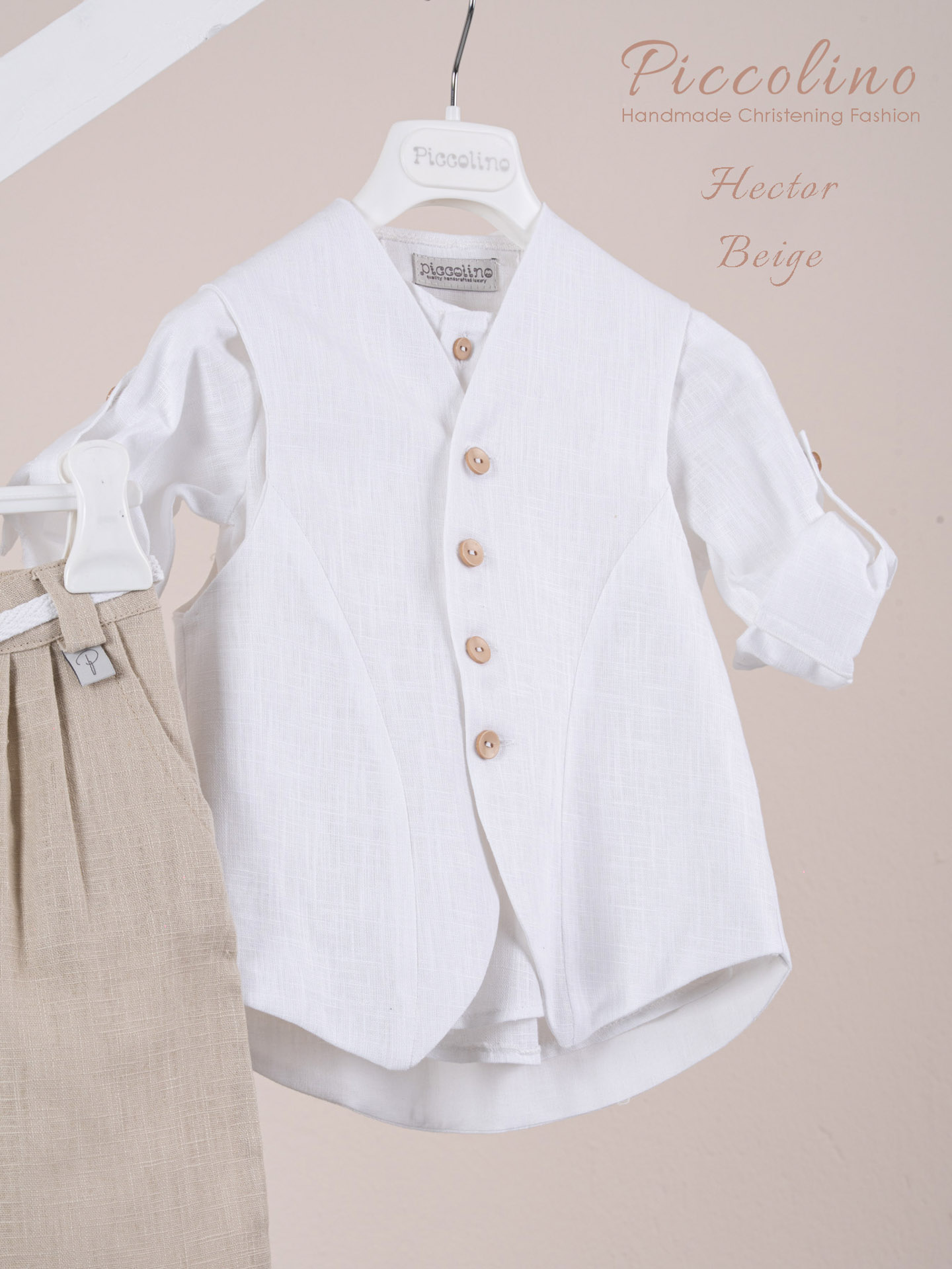 Βαπτιστικό κοστούμι Piccolino Hector σε χρώμα Beige. Περιλαμβάνει καμπυλόγραμμο λινό γιλέκο με κουφόπιετα στην πίσω πλευρά , λινή πουκαμίσα, παντελόνι λινό με πιέτες σε χρώμα Beige και ζωνάκι με double D δέσιμο και καπέλο με φάσα. Διαθέσιμο σε 4 μεγέθη 6-12, 12-18, 18-24, 24-36(εξτρά χρέωση)