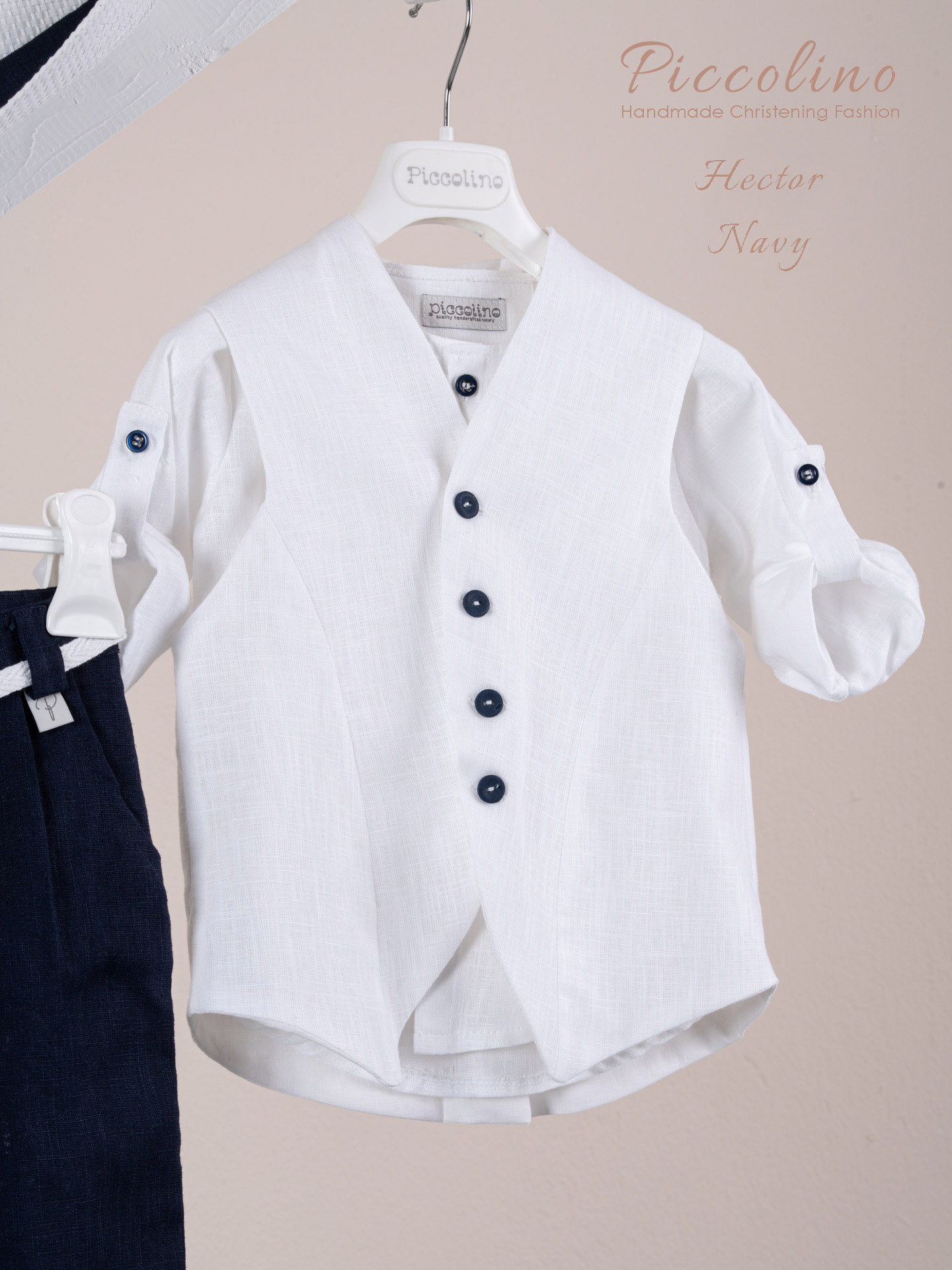 Βαπτιστικό κοστούμι Piccolino Hector σε χρώμα Navy. Περιλαμβάνει καμπυλόγραμμο λινό γιλέκο με κουφόπιετα στην πίσω πλευρά , λινή πουκαμίσα, παντελόνι λινό με πιέτες σε χρώμα Navy και ζωνάκι με double D δέσιμο και καπέλο με φάσα. Διαθέσιμο σε 4 μεγέθη 6-12, 12-18, 18-24, 24-36(εξτρά χρέωση)