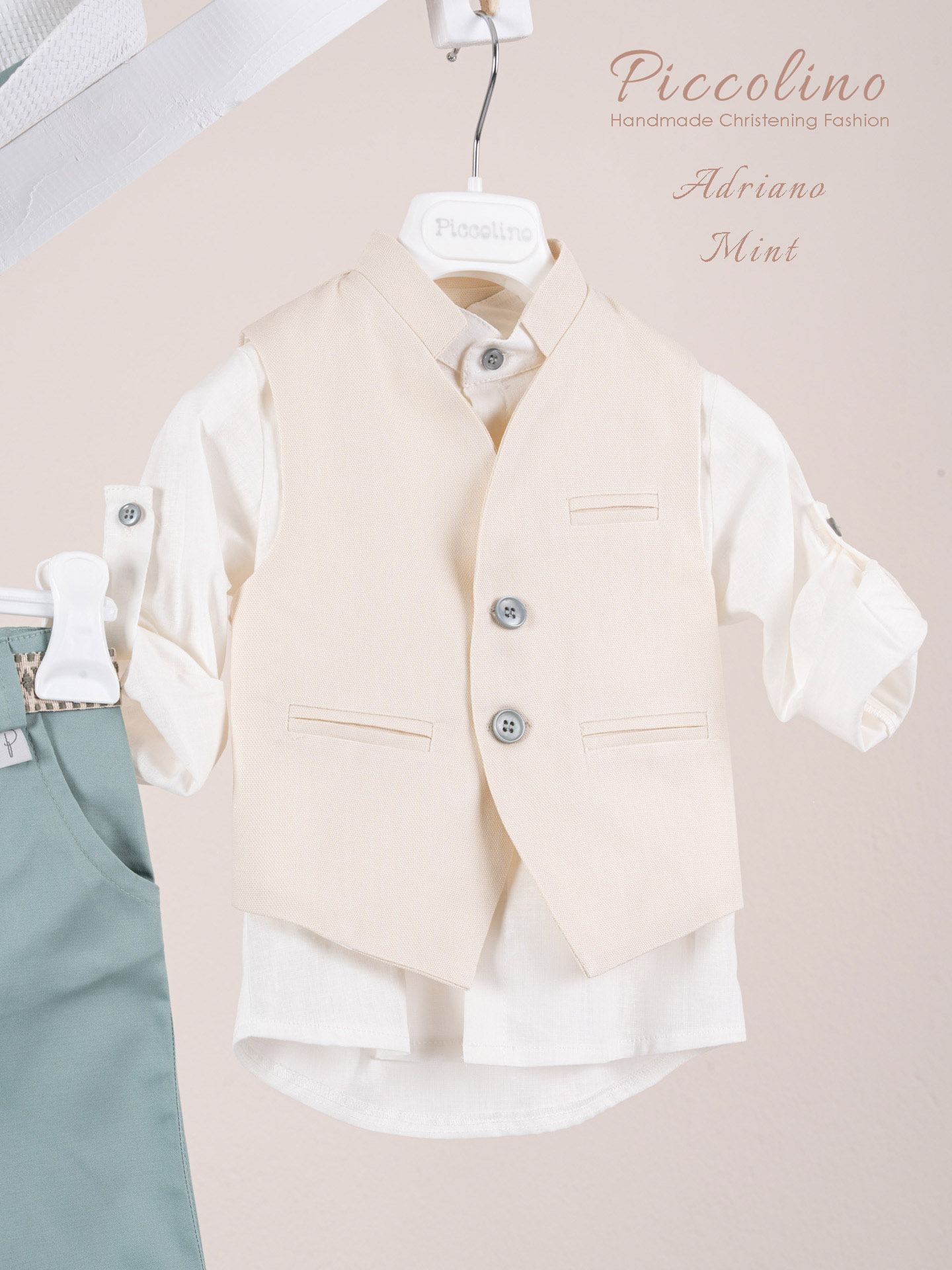 Βαπτιστικό κοστούμι Piccolino Adriano σε χρώμα Mint. Περιλαμβάνει βαμβακερό καμπυλόγραμμο γιλέκο, πουκάμισο λινό με μάο γιακά, παντελόνι βαμβακερό σε χρώμα Mint, ζώνη με double D δέσιμο και καπέλο με φάσα. Διαθέσιμο σε 4 μεγέθη 6-12, 12-18, 18-24, 24-36(εξτρά χρέωση)