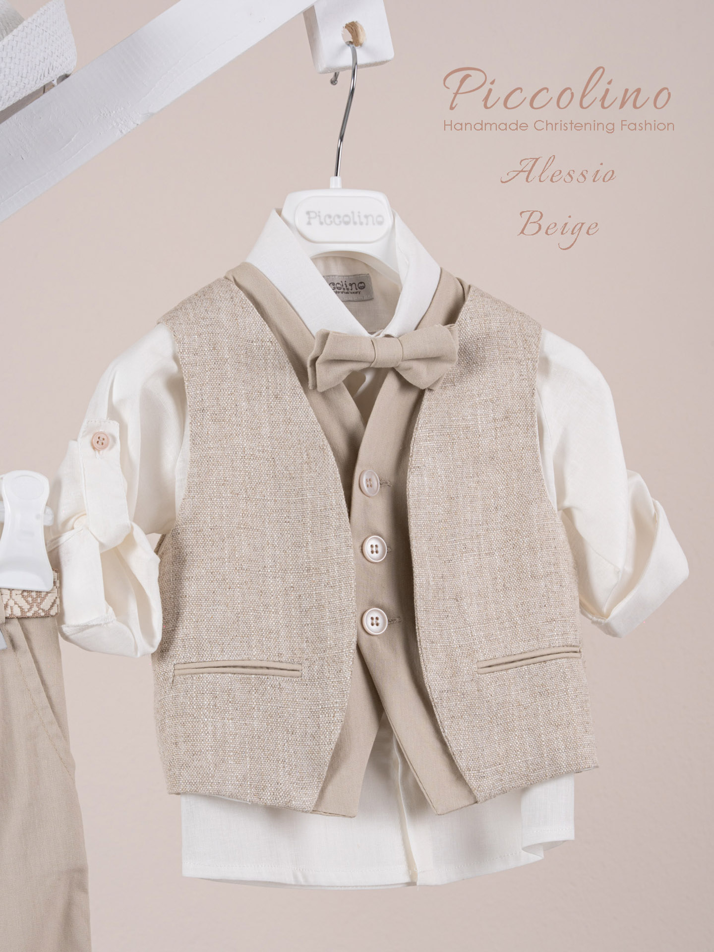 Βαπτιστικό κοστούμι Piccolino Alessio σε χρώμα Beige. Περιλαμβάνει γιλέκο με διπλή μόστρα σε διχρωμία, πουκάμισο λινό, παντελόνι λινό με πιέτες σε χρώμα Beige, παπιγιόν, ζώνη και καπέλο με φάσα. Διαθέσιμο σε 4 μεγέθη 6-12, 12-18, 18-24, 24-36(εξτρά χρέωση)