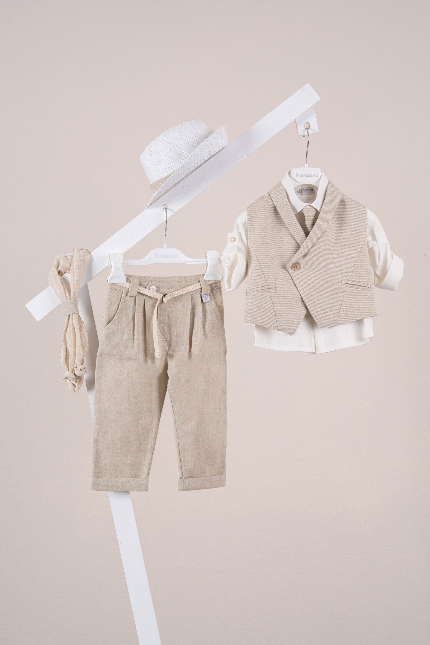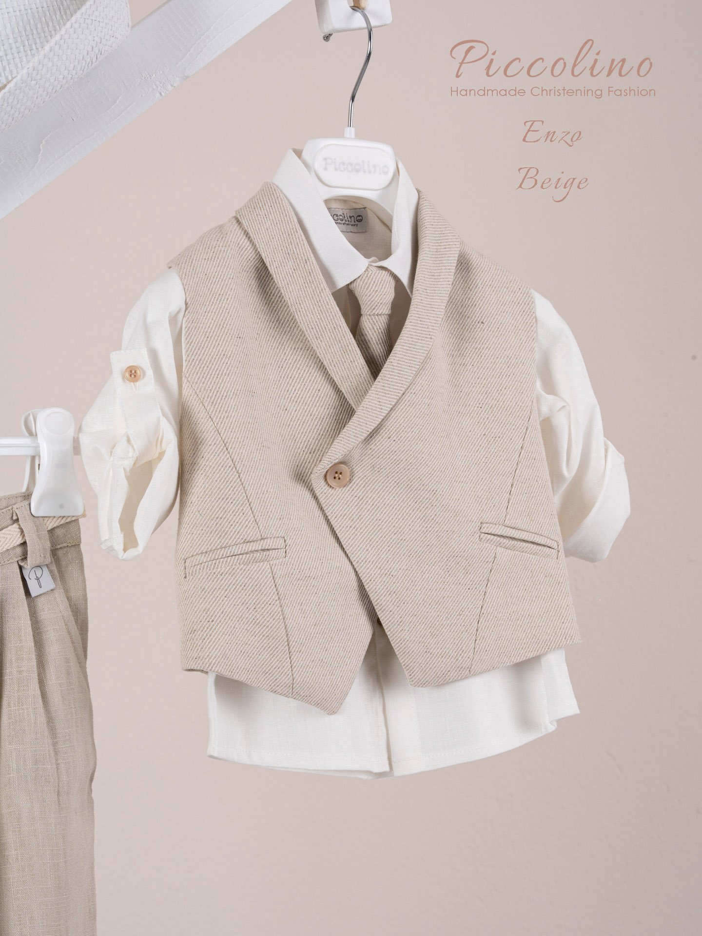 Βαπτιστικό κοστούμι Piccolino Enzo σε χρώμα Beige. Περιλαμβάνει γιλέκο σταυρωτό με μύτη μονόκουμπο, πουκάμισο λινό, παντελόνι λινό με πιέτες σε χρώμα Beige, γραβάτα, φουλάρι λινό με δέσιμο σε ίδια απόχρωση με το παντελόνι, ζωνάκι με double D δέσιμο και καπέλο με φάσα. Διαθέσιμο σε 4 μεγέθη 6-12, 12-18, 18-24, 24-36(εξτρά χρέωση)