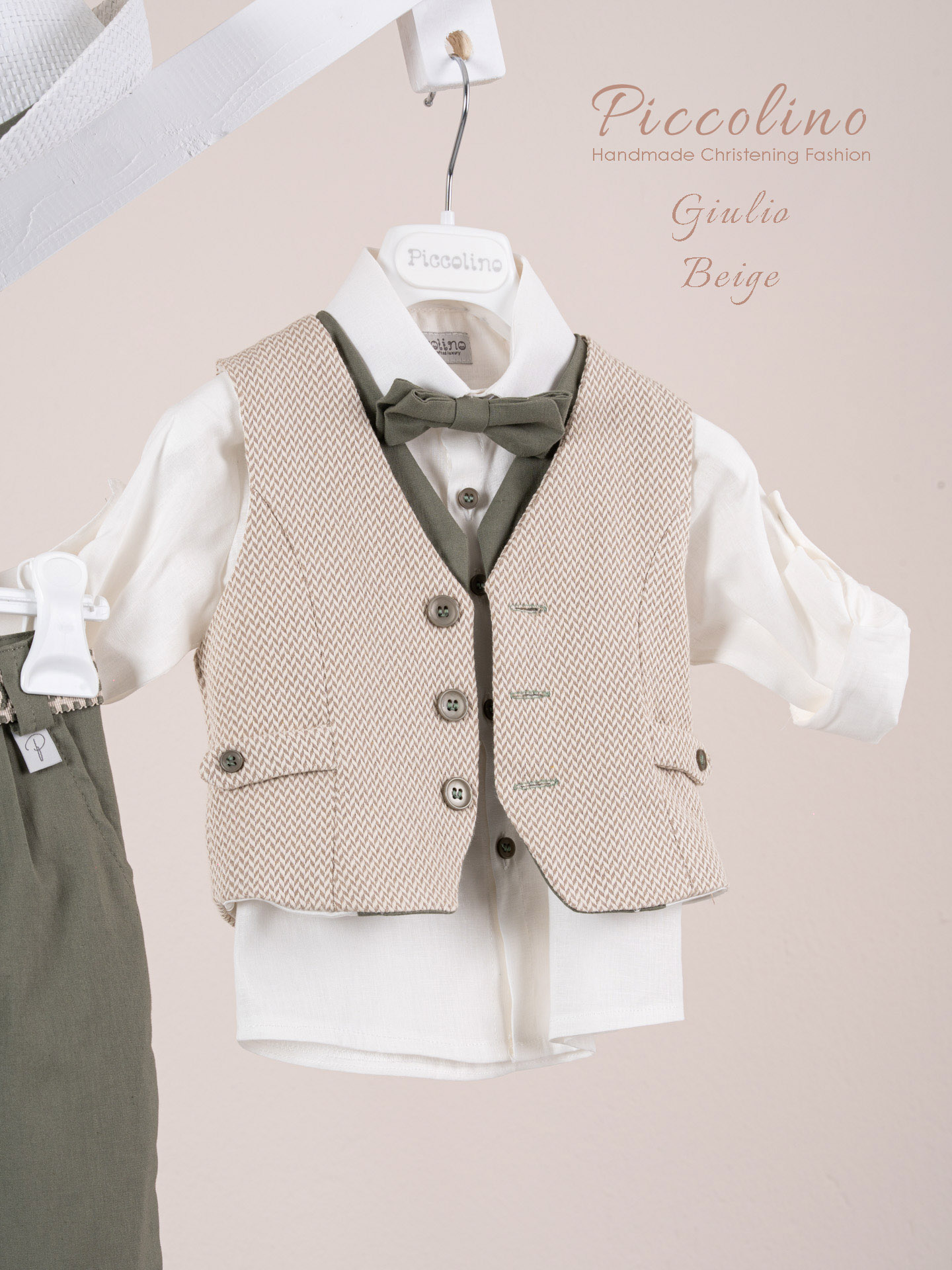 Βαπτιστικό κοστούμι Piccolino Giulio σε χρώμα Olive. Περιλαμβάνει γιλέκο με διπλή μόστρα σε διχρωμία, πουκάμισο λινό, παντελόνι λινό με πιέτες σε χρώμα Olive, παπιγιόν, ζώνη και καπέλο με φάσα. Διαθέσιμο σε 4 μεγέθη 6-12, 12-18, 18-24, 24-36(εξτρά χρέωση)