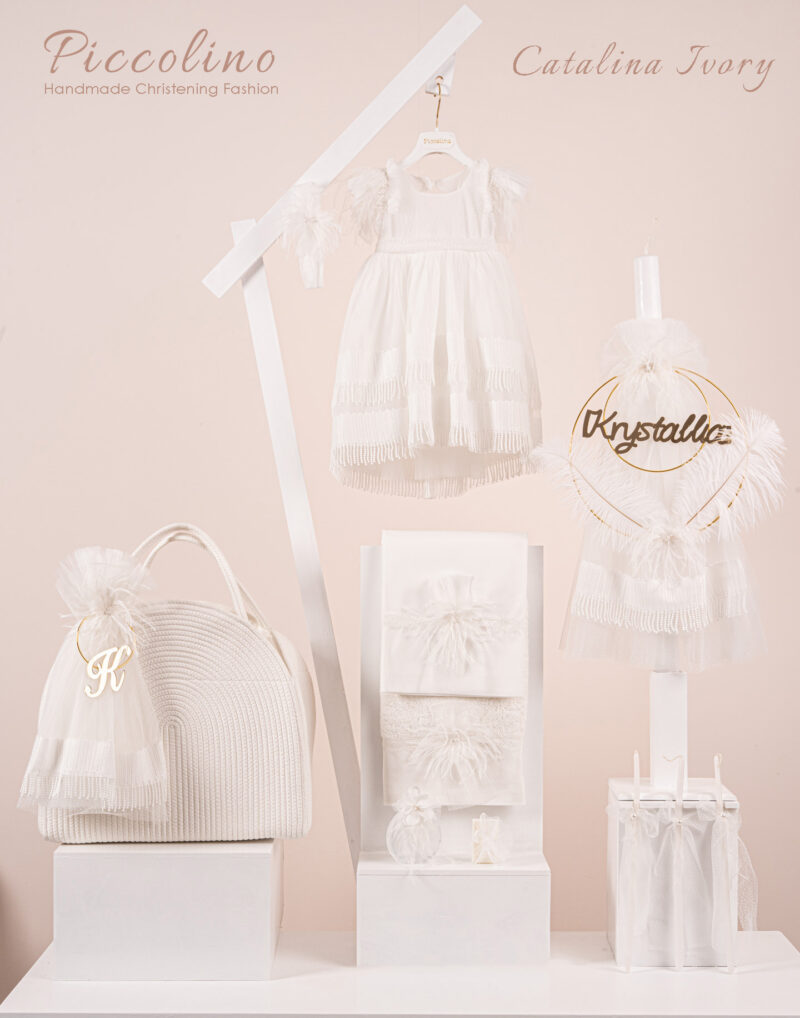 Βαπτιστικό πακέτο Piccolino Catalina ivory περιλαμβάνει φόρεμα ,σετ λαδόπανα, λαμπάδα, λαδοσετ και στολισμένη τσάντα ropes