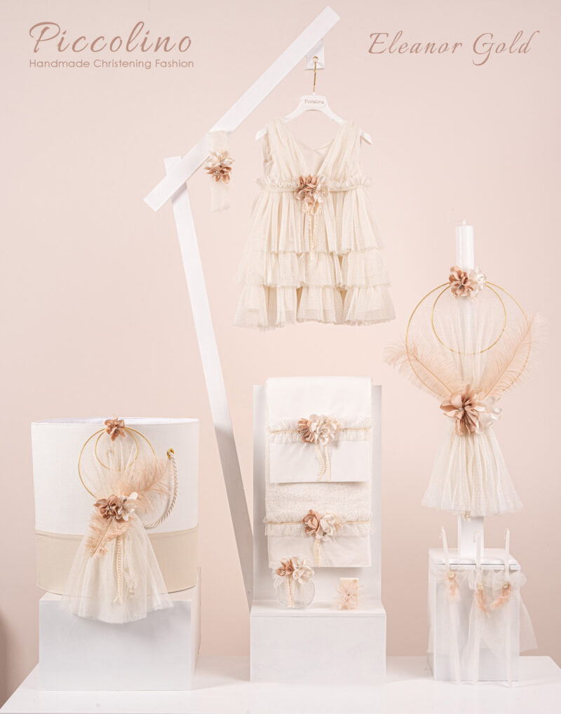 Βαπτιστικό πακέτο Piccolino Eleanor gpld περιλαμβάνει φόρεμα ,σετ λαδόπανα, λαμπάδα, λαδοσετ και στολισμένο καλάθι δερμάτινο