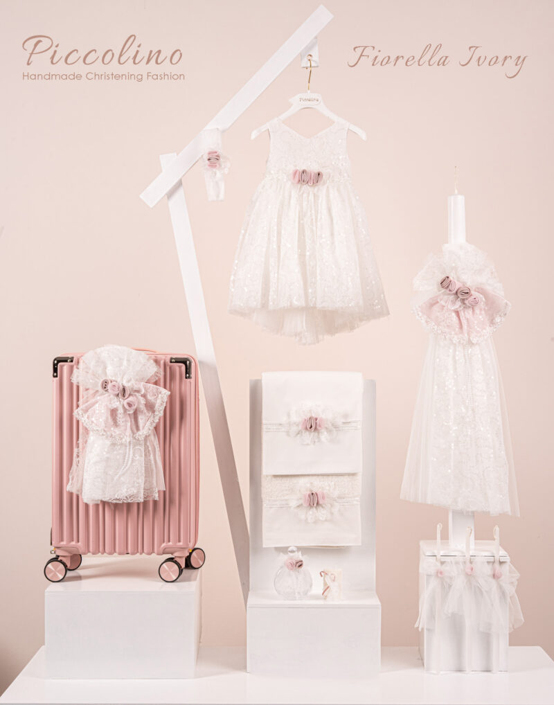 Βαπτιστικό πακέτο Piccolino Fiorella ivory περιλαμβάνει φόρεμα ,σετ λαδόπανα, λαμπάδα, λαδοσετ και στολισμένη βαλίτσα pink