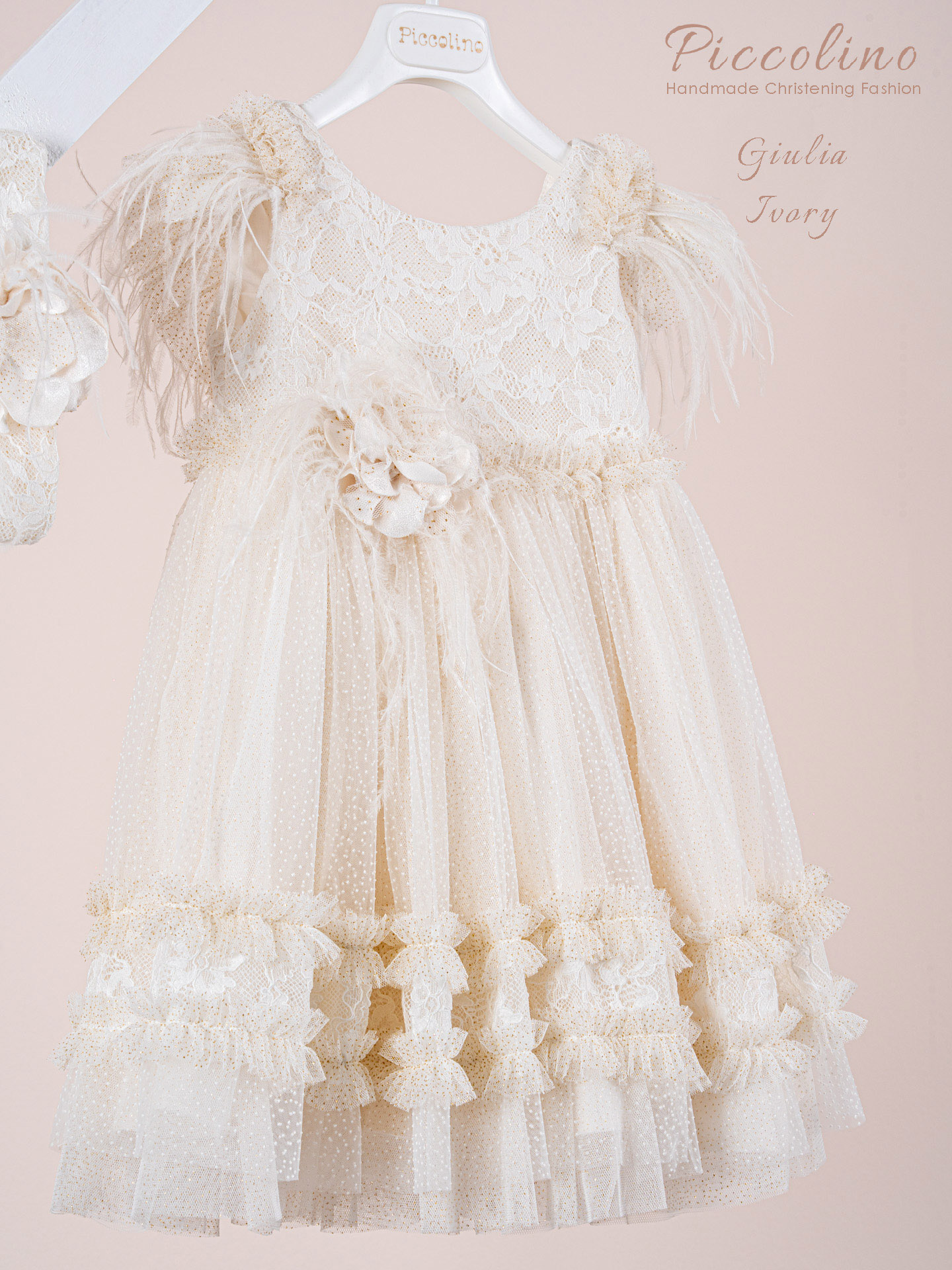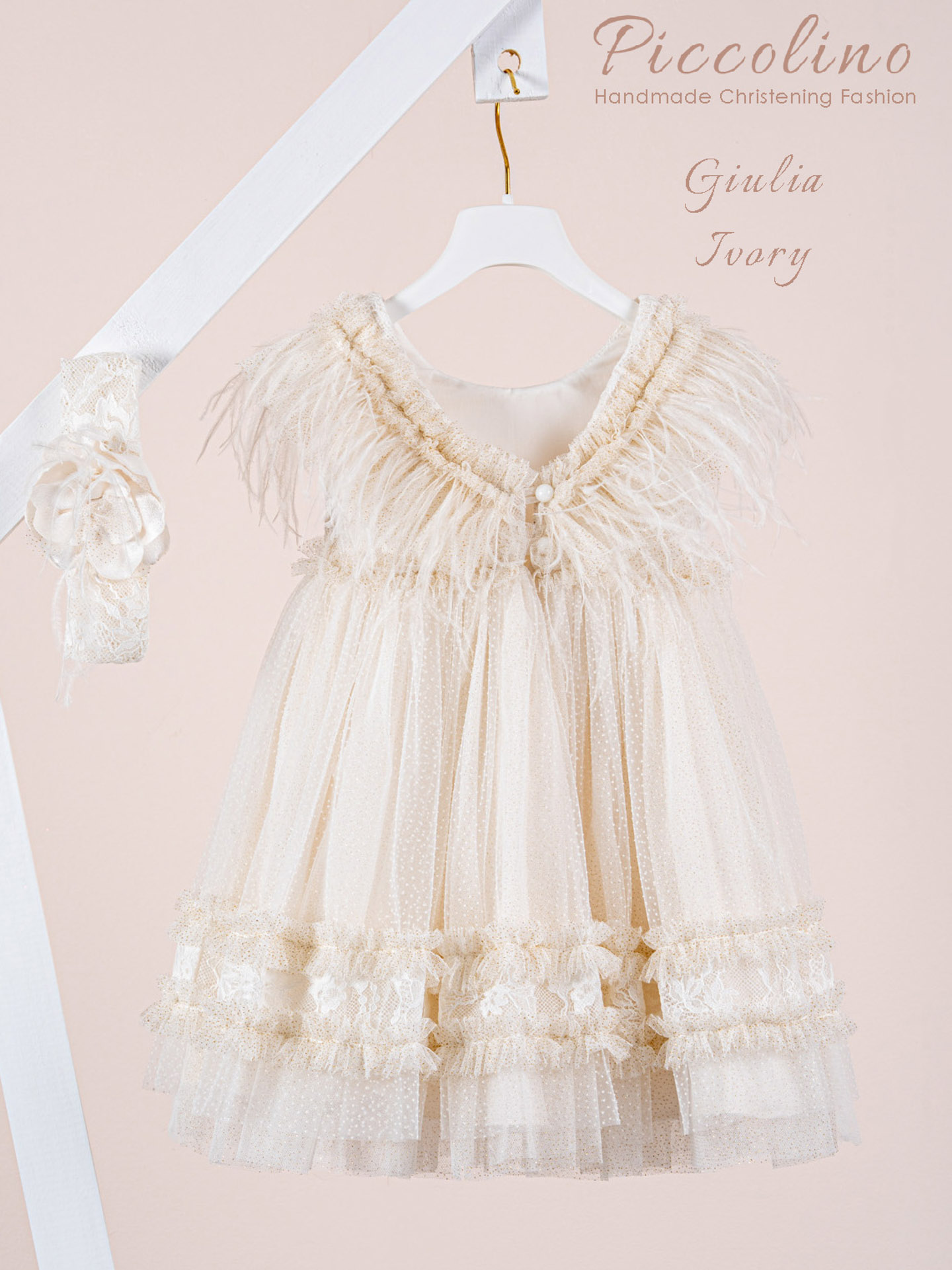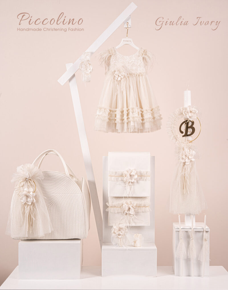 Βαπτιστικό πακέτο Piccolino Giulia ivory περιλαμβάνει φόρεμα ,σετ λαδόπανα, λαμπάδα, λαδοσετ και στολισμένη τσάντα ropes