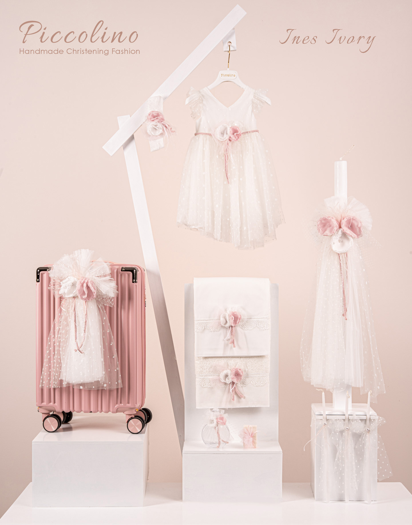 Βαπτιστικό πακέτο Piccolino Ines ivory περιλαμβάνει φόρεμα ,σετ λαδόπανα, λαμπάδα, λαδοσετ και στολισμένη βαλίτσα pink