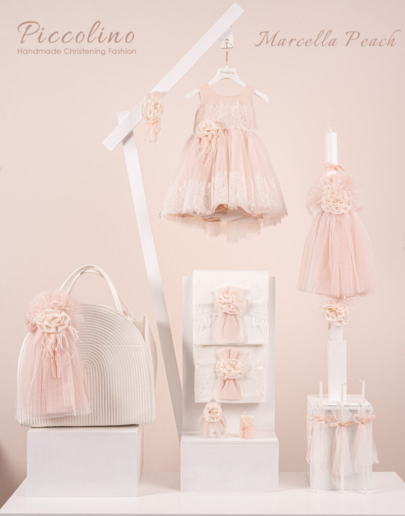 Βαπτιστικό πακέτο Piccolino Marcella peach περιλαμβάνει φόρεμα ,σετ λαδόπανα, λαμπάδα, λαδοσετ και στολισμένη τσάντα ropes