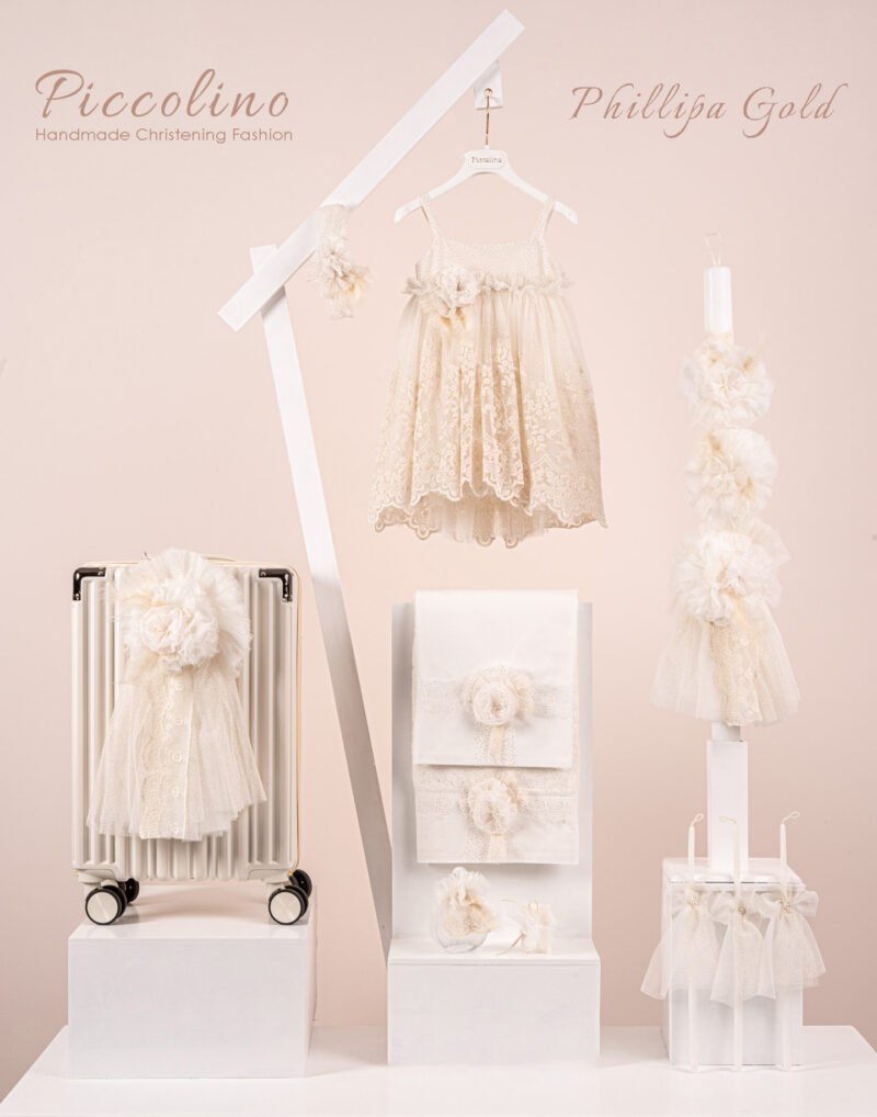 Βαπτιστικό πακέτο Piccolino Phillipa gold περιλαμβάνει φόρεμα ,σετ λαδόπανα, λαμπάδα, λαδοσετ και στολισμένη βαλίτσα cream