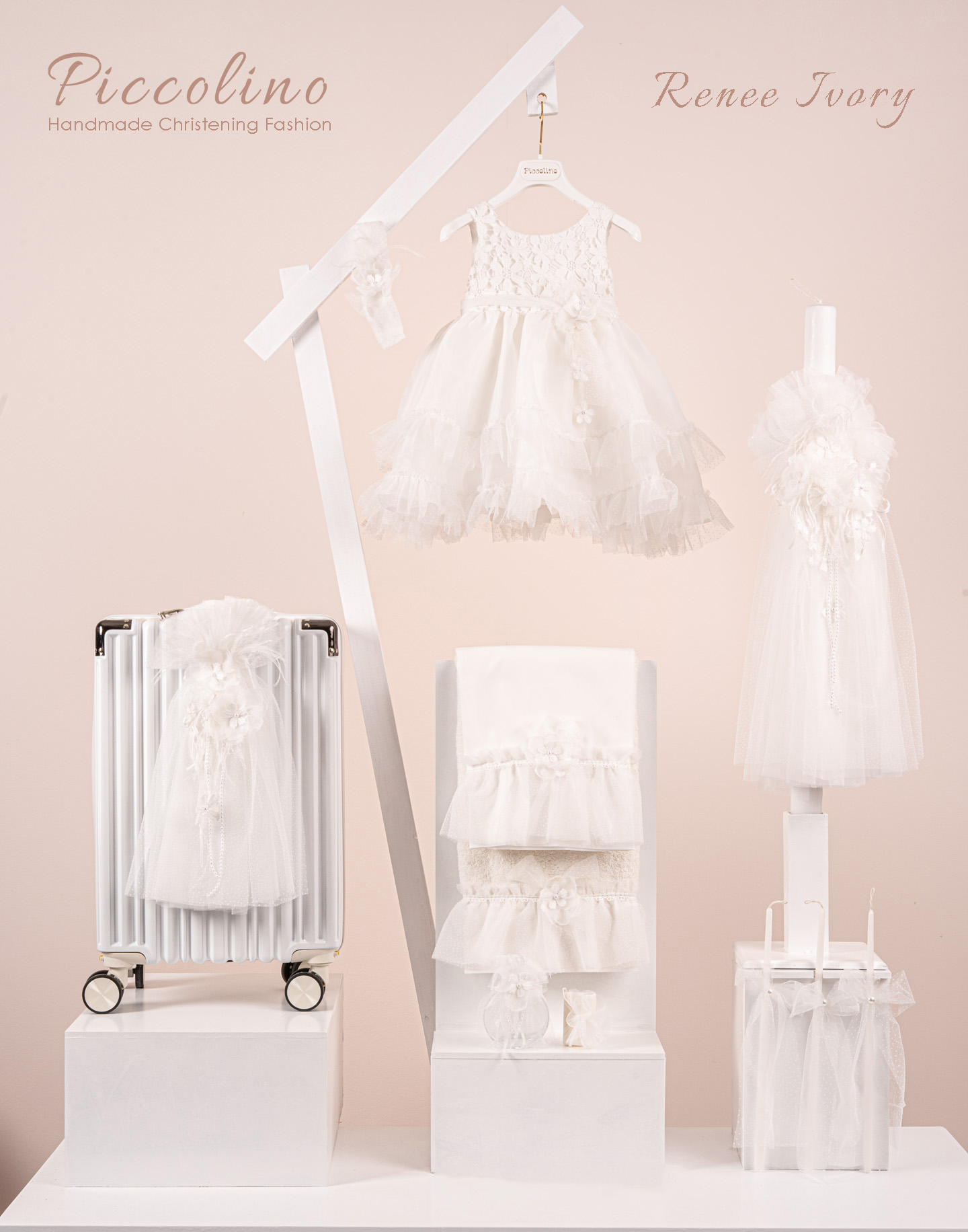 Βαπτιστικό πακέτο Piccolino Renee ivory περιλαμβάνει φόρεμα ,σετ λαδόπανα, λαμπάδα, λαδοσετ και στολισμένη βαλίτσα white