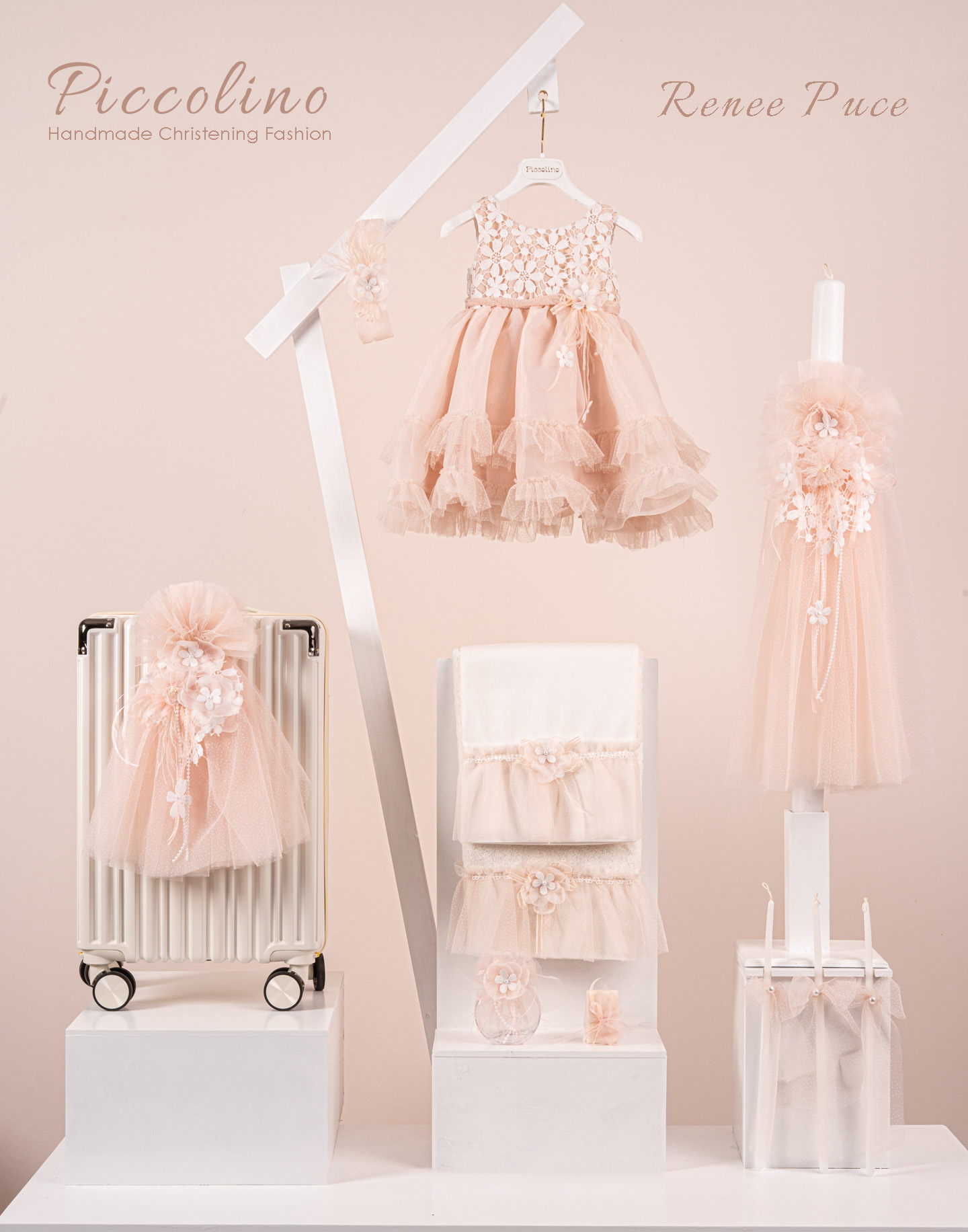 Βαπτιστικό πακέτο Piccolino Renee puce περιλαμβάνει φόρεμα ,σετ λαδόπανα, λαμπάδα, λαδοσετ και στολισμένη βαλίτσα cream