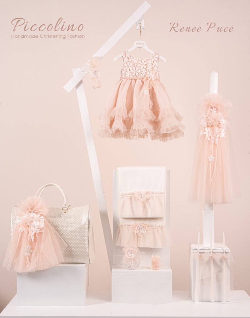 Βαπτιστικό πακέτο Piccolino Renee puce περιλαμβάνει φόρεμα ,σετ λαδόπανα, λαμπάδα, λαδοσετ και στολισμένη τσάντα καπιτονέ