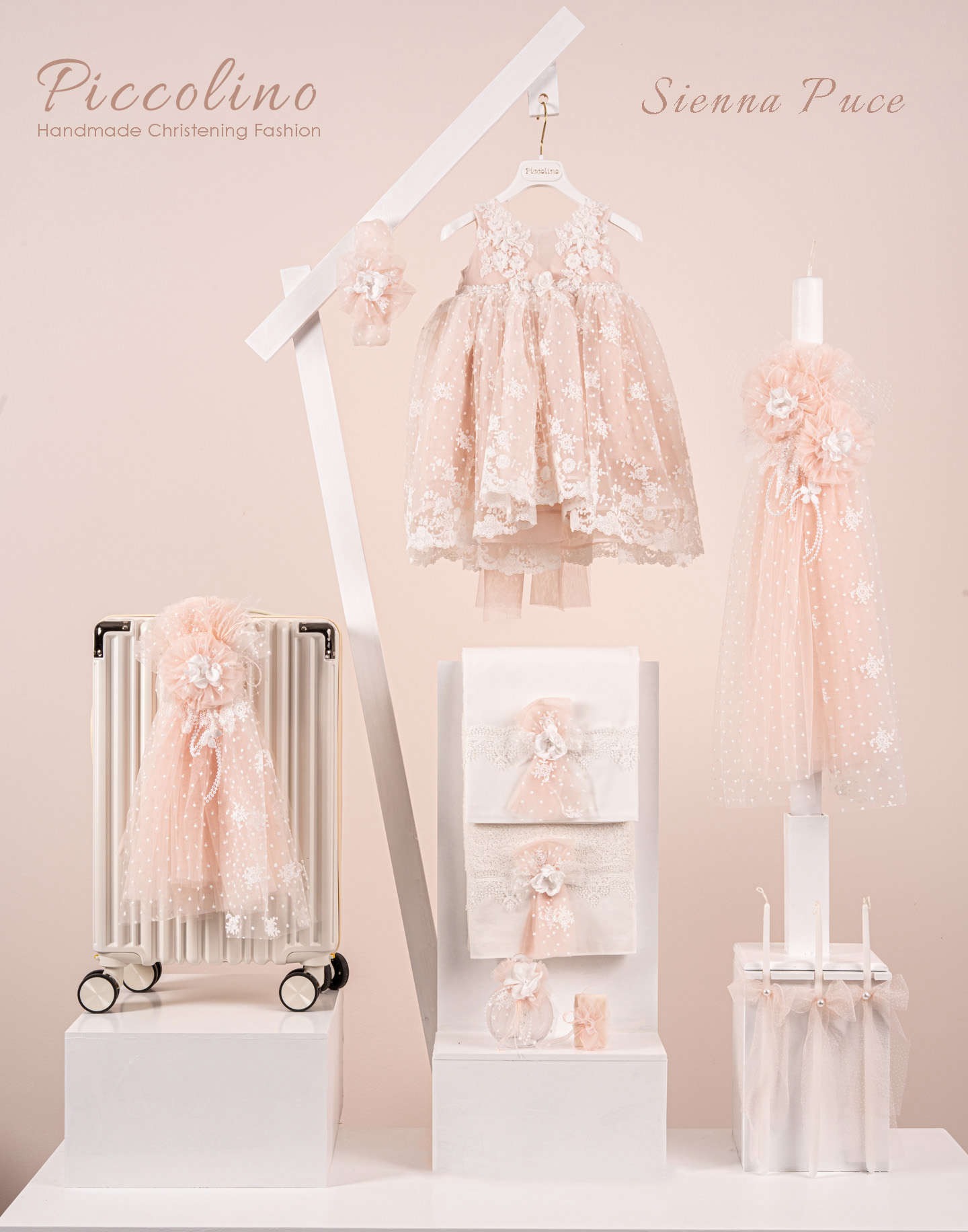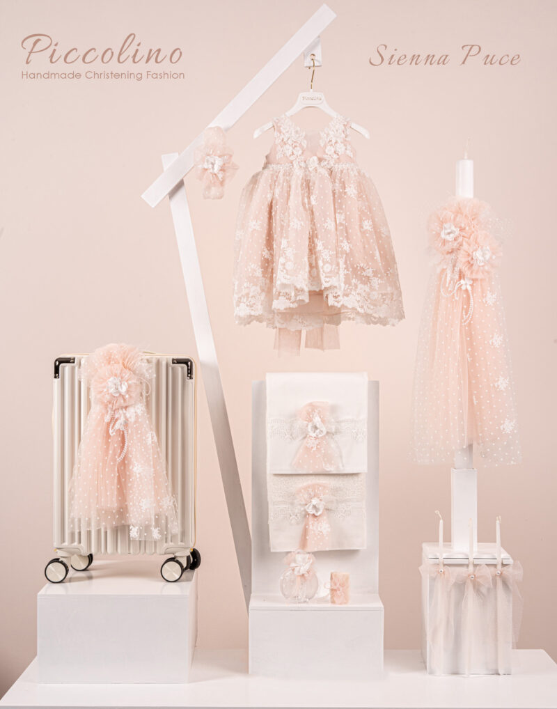 Βαπτιστικό πακέτο Piccolino Sienna puce περιλαμβάνει φόρεμα ,σετ λαδόπανα, λαμπάδα, λαδοσετ και στολισμένη βαλίτσα cream