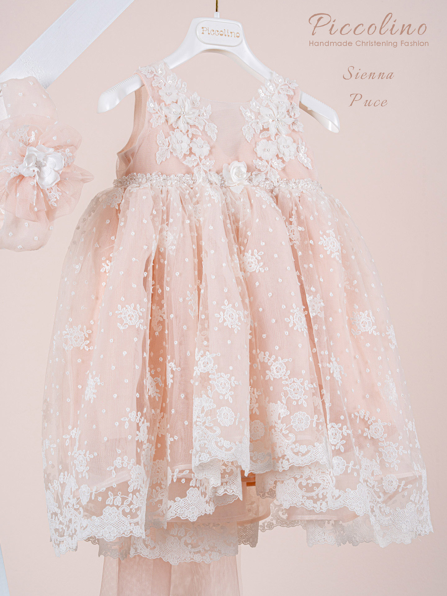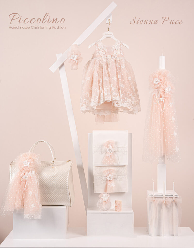 Βαπτιστικό πακέτο Piccolino Sienna puce περιλαμβάνει φόρεμα ,σετ λαδόπανα, λαμπάδα, λαδοσετ και στολισμένη τσάντα καπιτονέ