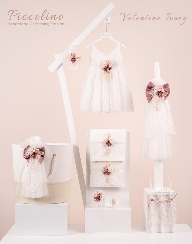 Βαπτιστικό πακέτο Piccolino Valentina ivory περιλαμβάνει φόρεμα ,σετ λαδόπανα, λαμπάδα, λαδοσετ και στολισμένο καλάθι δερμάτινο