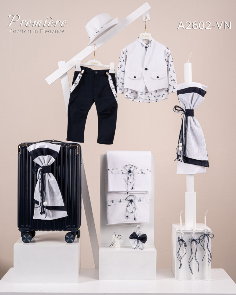 Βαπτιστικό πακέτο Premiere A2601 περιλαμβάνει κοστούμι ,σετ λαδόπανα, λαμπάδα, λαδοσετ και στολισμένη βαλίτσα navy