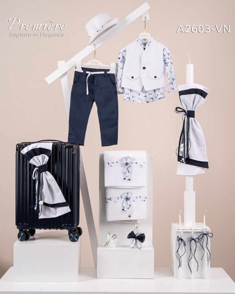 Βαπτιστικό πακέτο Premiere A2601 περιλαμβάνει κοστούμι ,σετ λαδόπανα, λαμπάδα, λαδοσετ και στολισμένη βαλίτσα navy