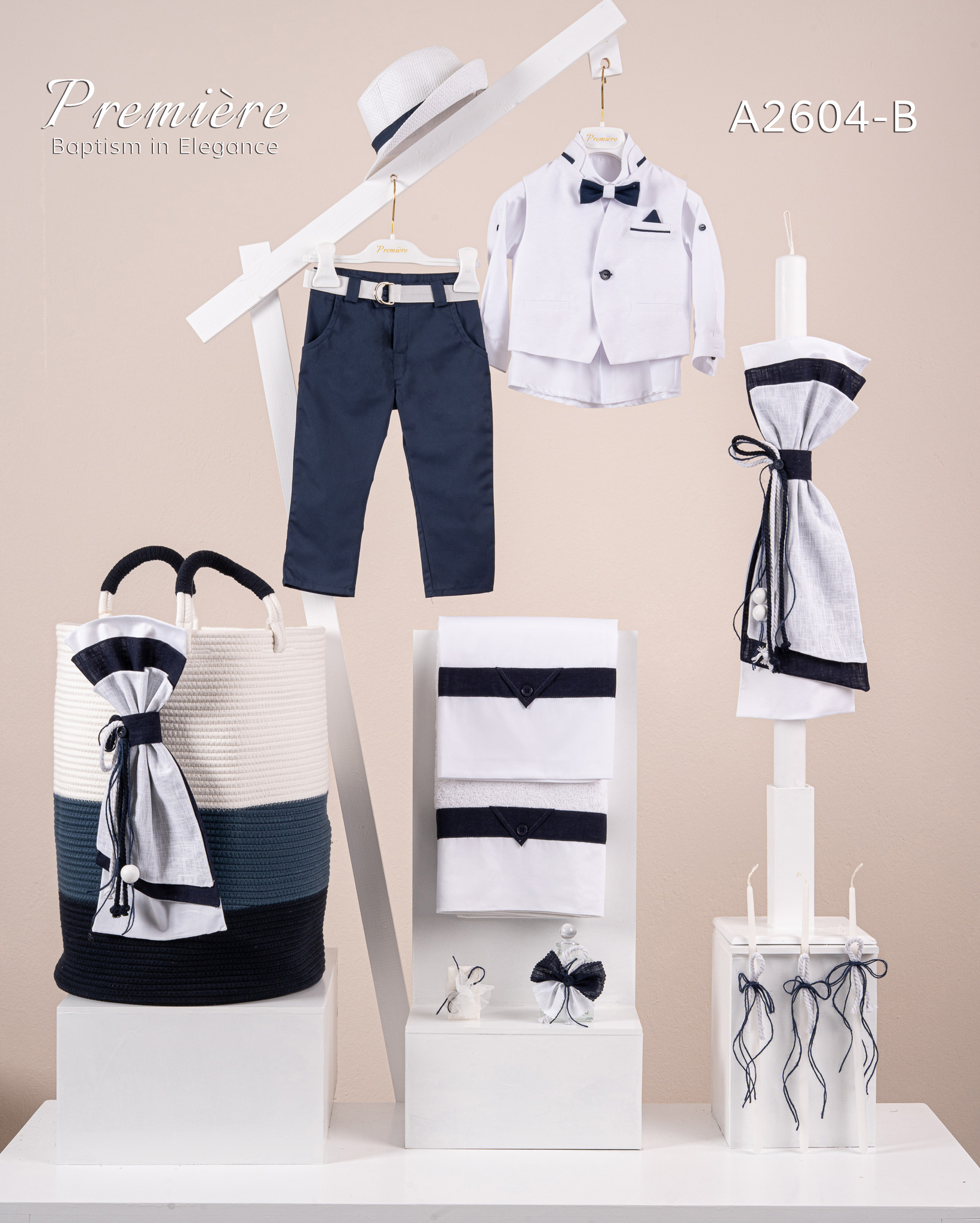 Βαπτιστικό πακέτο Premiere A2601 περιλαμβάνει κοστούμι ,σετ λαδόπανα, λαμπάδα, λαδοσετ και στολισμένο καλάθι barel navy