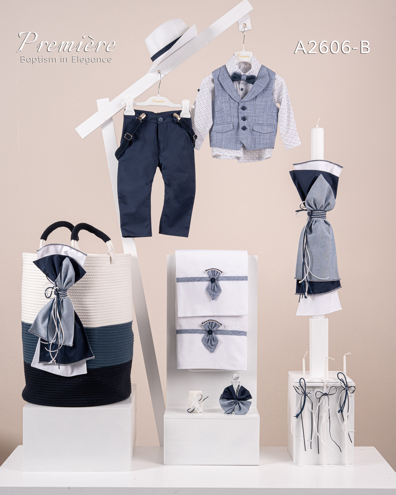Βαπτιστικό πακέτο Premiere A2601 περιλαμβάνει κοστούμι ,σετ λαδόπανα, λαμπάδα, λαδοσετ και στολισμένο καλάθι barel navy
