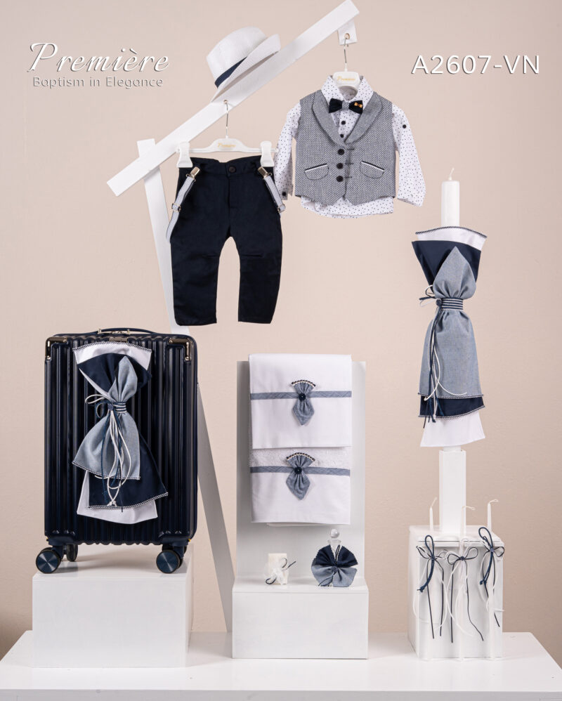 Βαπτιστικό πακέτο Premiere A2601 περιλαμβάνει κοστούμι ,σετ λαδόπανα, λαμπάδα, λαδοσετ και στολισμένη βαλίτσα navy
