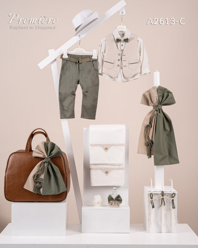 Βαπτιστικό πακέτο Premiere A2601 περιλαμβάνει κοστούμι ,σετ λαδόπανα, λαμπάδα, λαδοσετ και στολισμένη τσάντα camel
