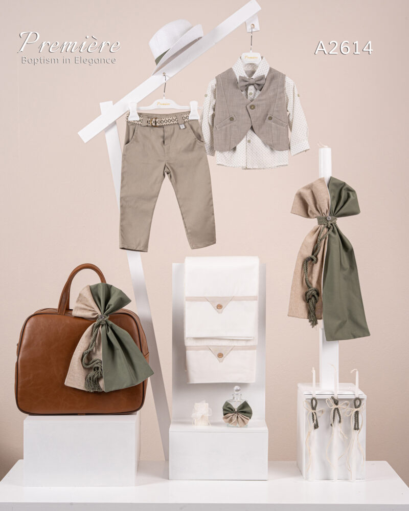 Βαπτιστικό πακέτο Premiere A2601 περιλαμβάνει κοστούμι ,σετ λαδόπανα, λαμπάδα, λαδοσετ και στολισμένη τσάντα camel