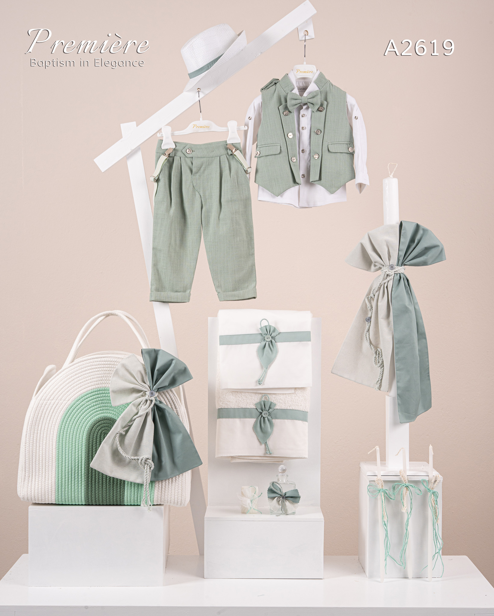 Βαπτιστικό πακέτο Premiere A2601 περιλαμβάνει κοστούμι ,σετ λαδόπανα, λαμπάδα, λαδοσετ και στολισμένη τσάντα ropes mint
