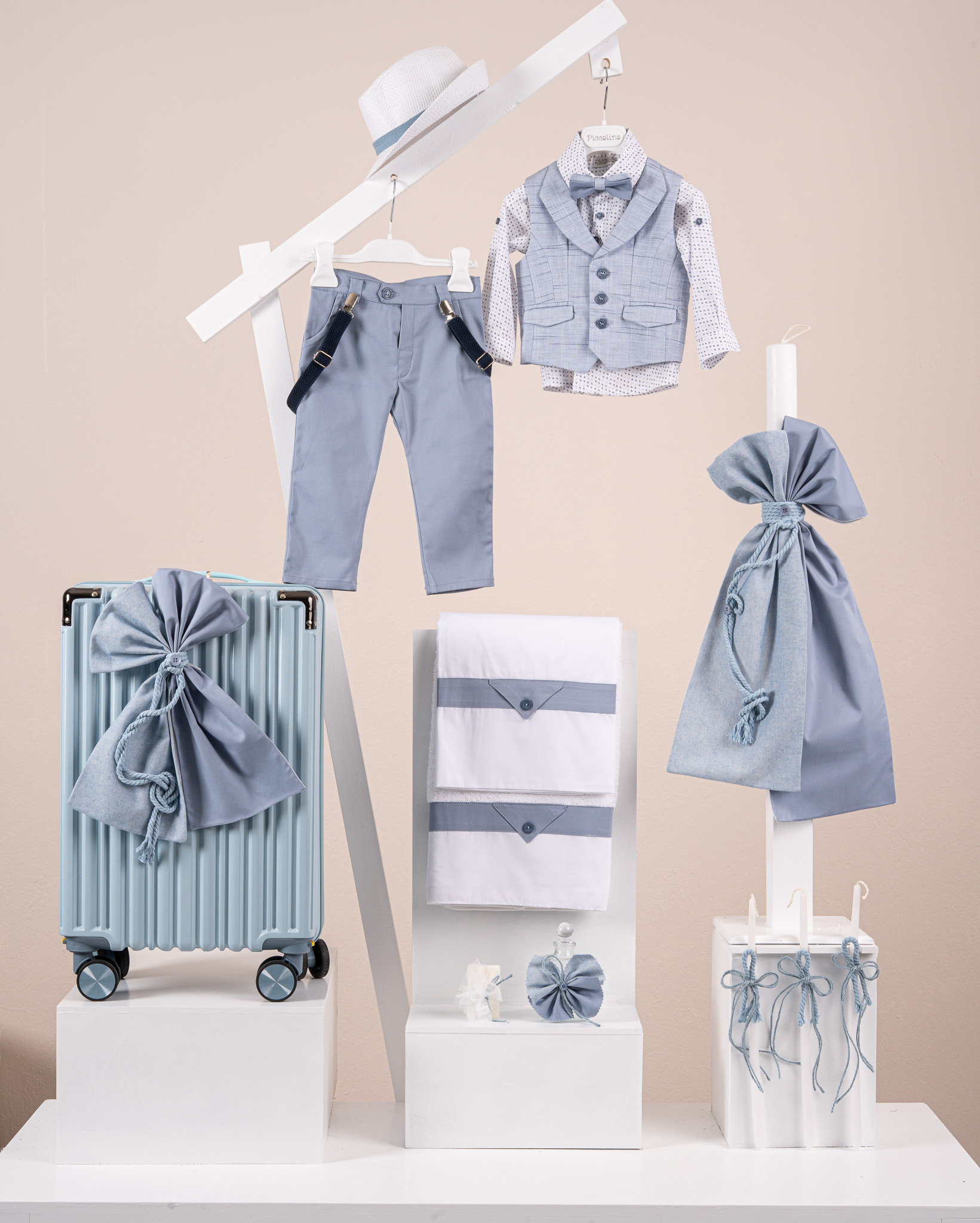 Βαπτιστικό πακέτο Premiere A2601 περιλαμβάνει κοστούμι ,σετ λαδόπανα, λαμπάδα, λαδοσετ και στολισμένη βαλίτσα light blue
