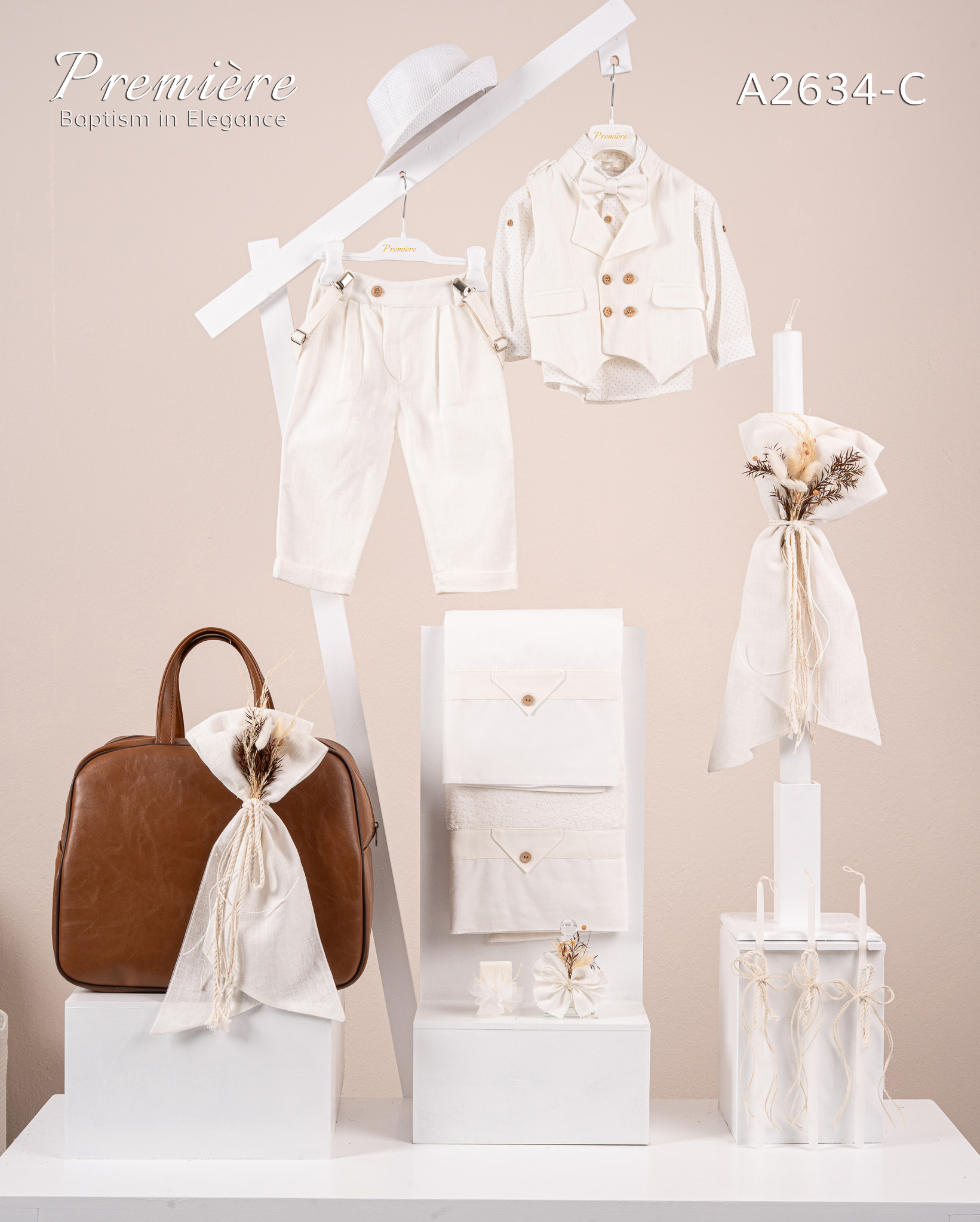 Βαπτιστικό πακέτο Premiere A2601 περιλαμβάνει κοστούμι ,σετ λαδόπανα, λαμπάδα, λαδοσετ και στολισμένη τσάντα camel