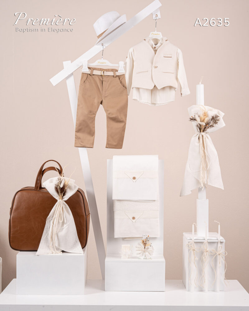 Βαπτιστικό πακέτο Premiere A2601 περιλαμβάνει κοστούμι ,σετ λαδόπανα, λαμπάδα, λαδοσετ και στολισμένη τσάντα camel