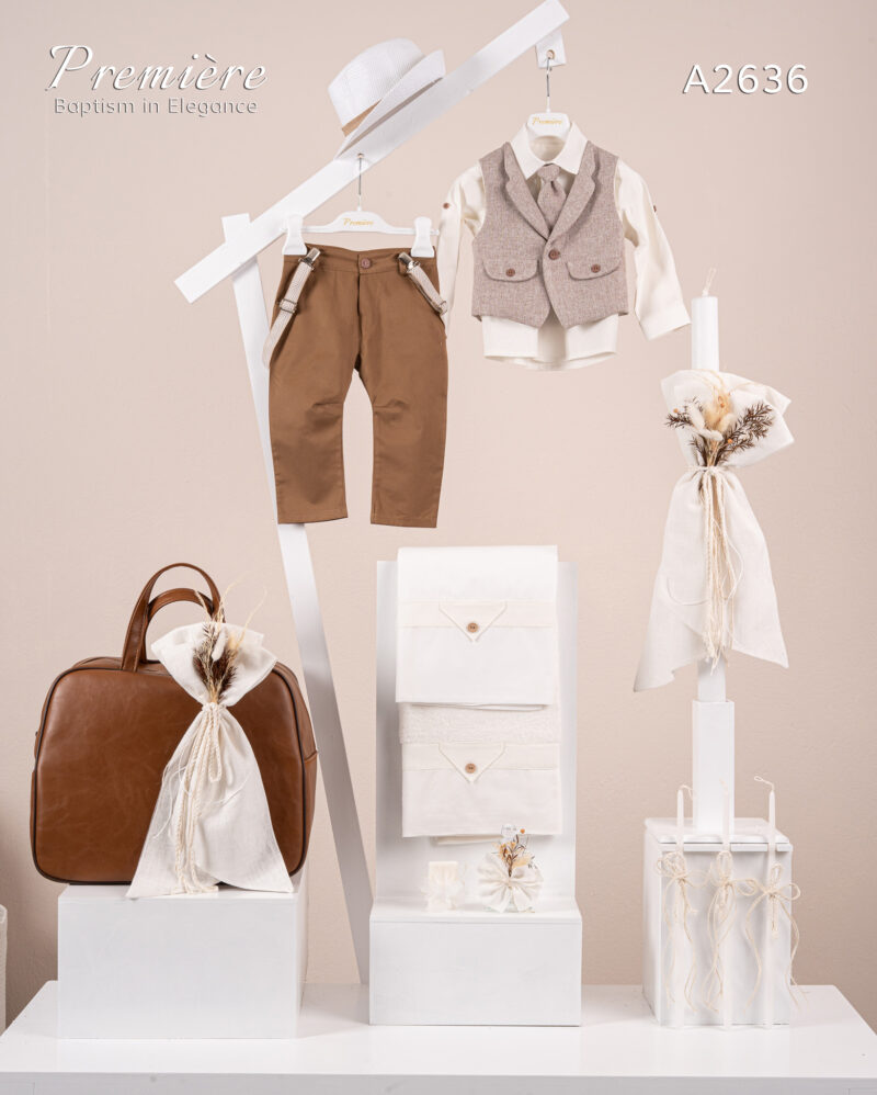 Βαπτιστικό πακέτο Premiere A2601 περιλαμβάνει κοστούμι ,σετ λαδόπανα, λαμπάδα, λαδοσετ και στολισμένη τσάντα camel