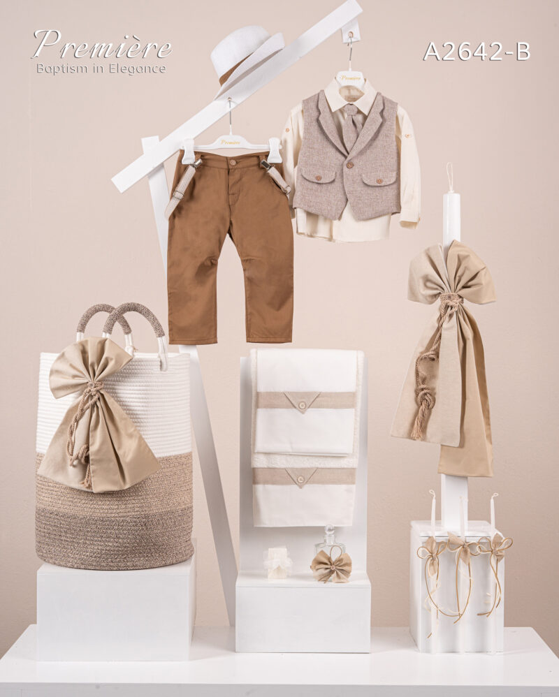 Βαπτιστικό πακέτο Premiere A2601 περιλαμβάνει κοστούμι ,σετ λαδόπανα, λαμπάδα, λαδοσετ και στολισμένο καλάθι barel cream