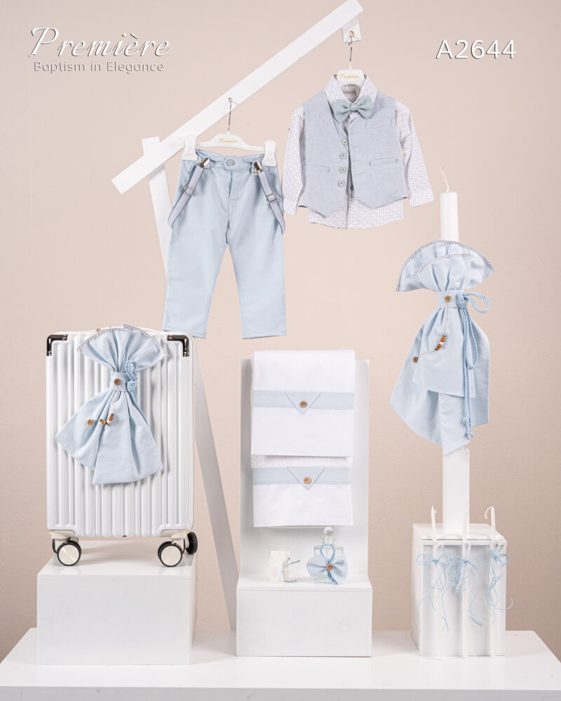 Βαπτιστικό πακέτο Premiere A2601 περιλαμβάνει κοστούμι ,σετ λαδόπανα, λαμπάδα, λαδοσετ και στολισμένη βαλίτσα white