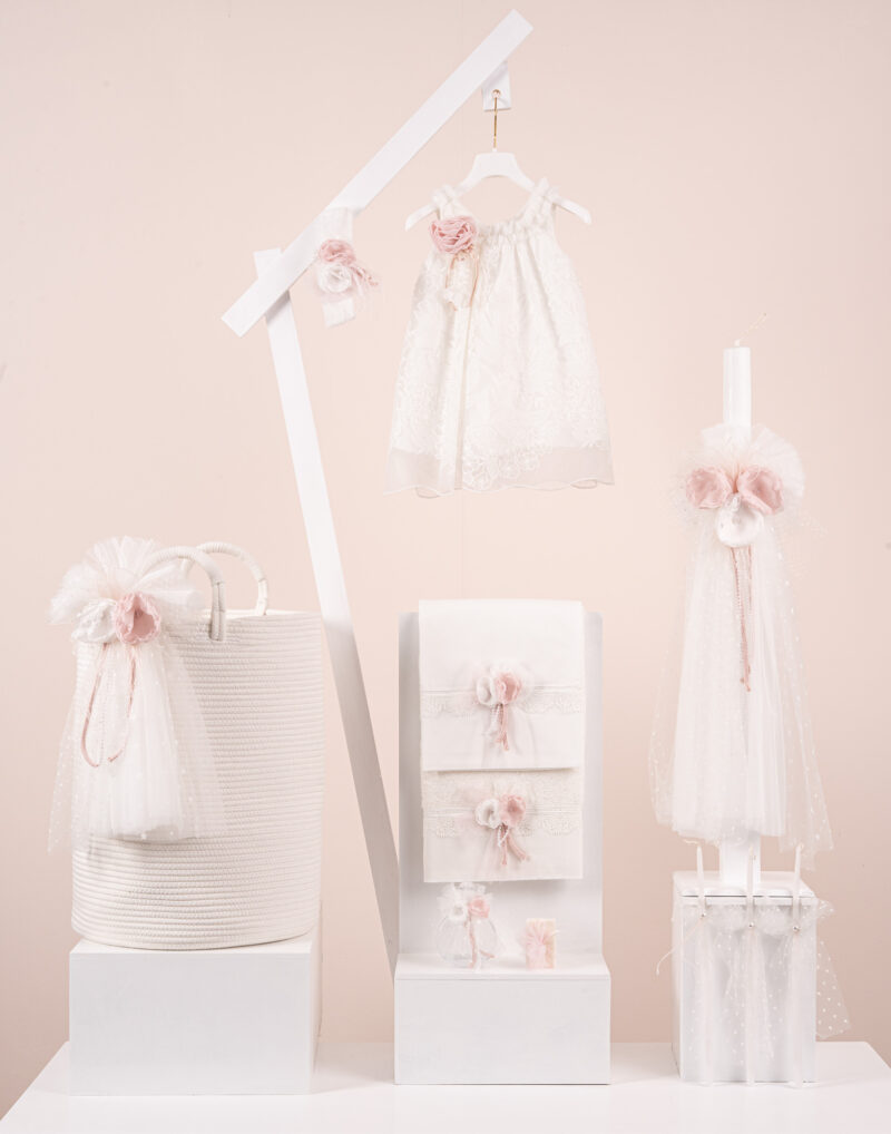 Βαπτιστικό πακέτο Premiere K2601 περιλαμβάνει φόρεμα ,σετ λαδόπανα, λαμπάδα, λαδοσετ και στολισμένο καλάθι barel