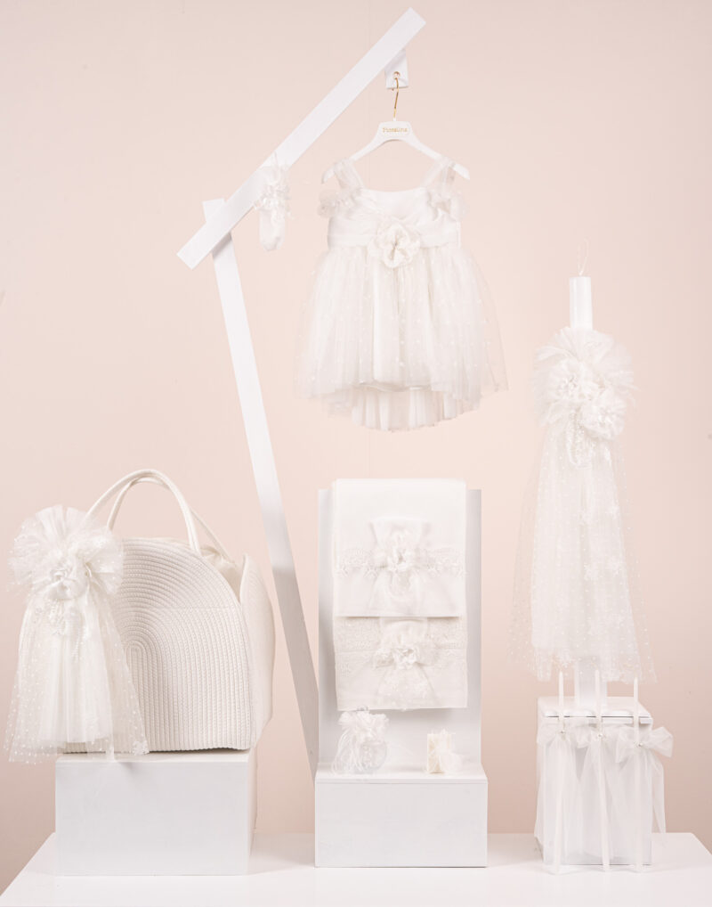 Βαπτιστικό πακέτο Premiere K2608 περιλαμβάνει φόρεμα ,σετ λαδόπανα, λαμπάδα, λαδοσετ και στολισμένη τσάντα ropes