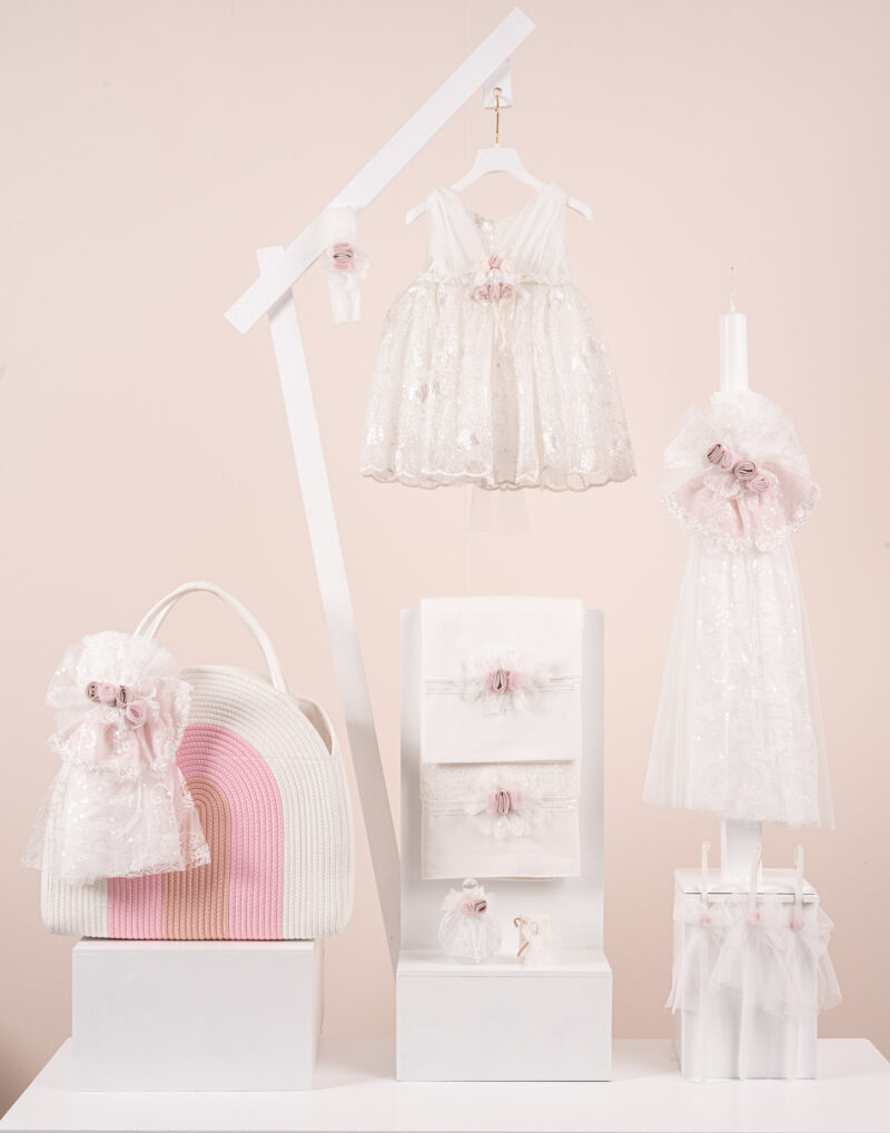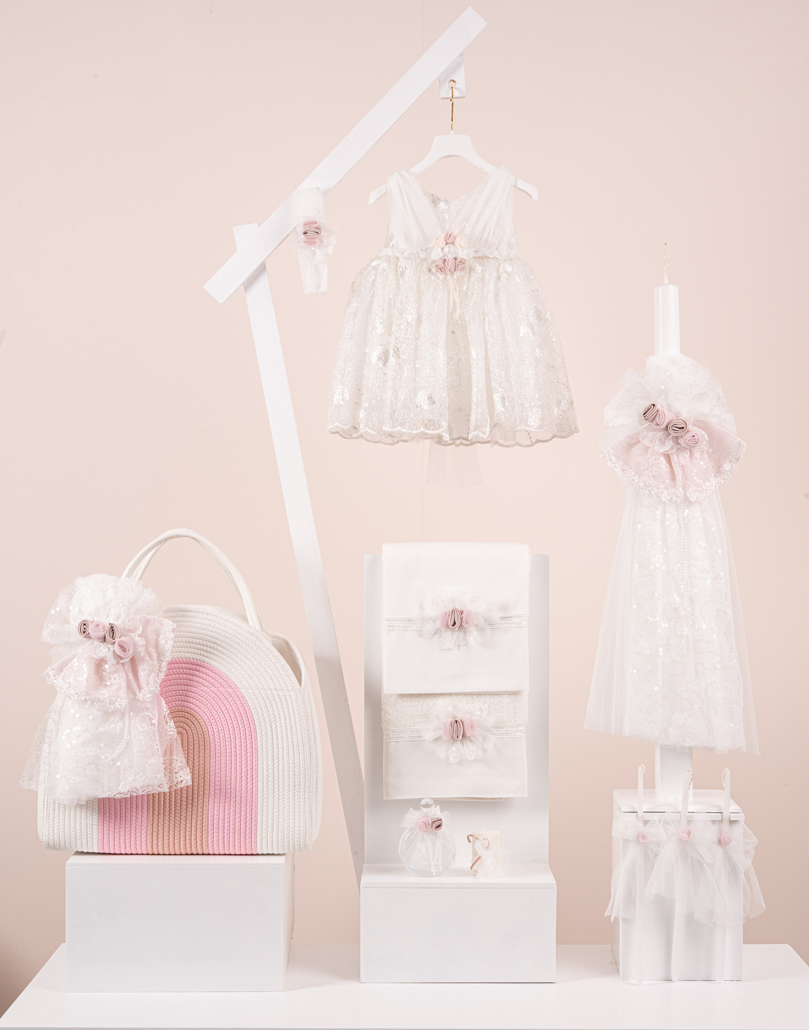 Βαπτιστικό πακέτο Premiere K2612 περιλαμβάνει φόρεμα ,σετ λαδόπανα, λαμπάδα, λαδοσετ και στολισμένη τσάντα barel ropes pink