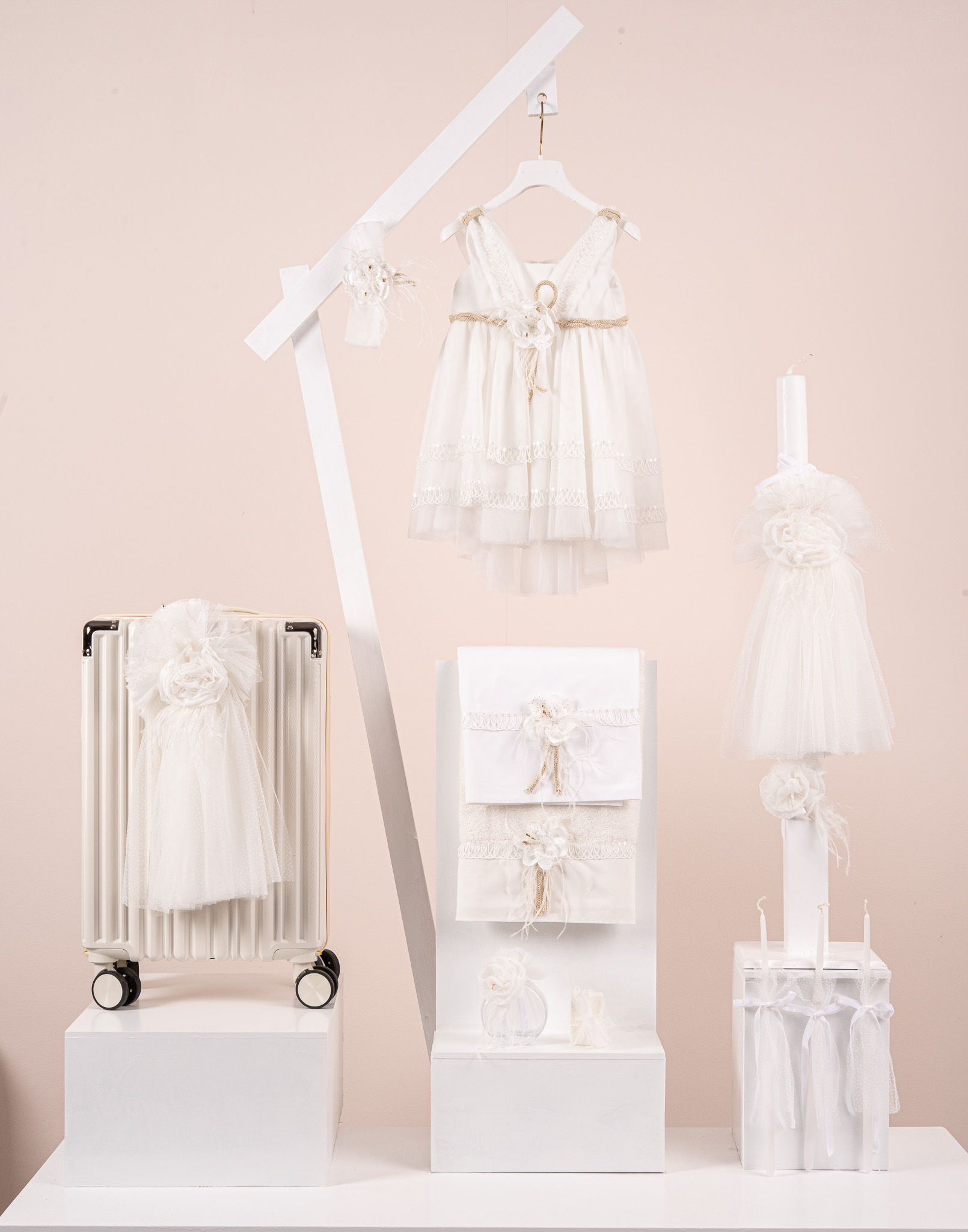 Βαπτιστικό πακέτο Premiere K2621 περιλαμβάνει φόρεμα ,σετ λαδόπανα, λαμπάδα, λαδοσετ και στολισμένη βαλίτσα cream