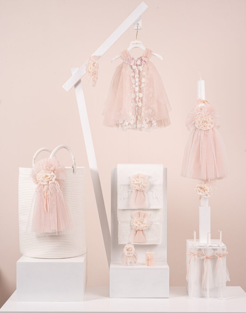 Βαπτιστικό πακέτο Premiere K2625 περιλαμβάνει φόρεμα ,σετ λαδόπανα, λαμπάδα, λαδοσετ και στολισμένο καλάθι barel ropes