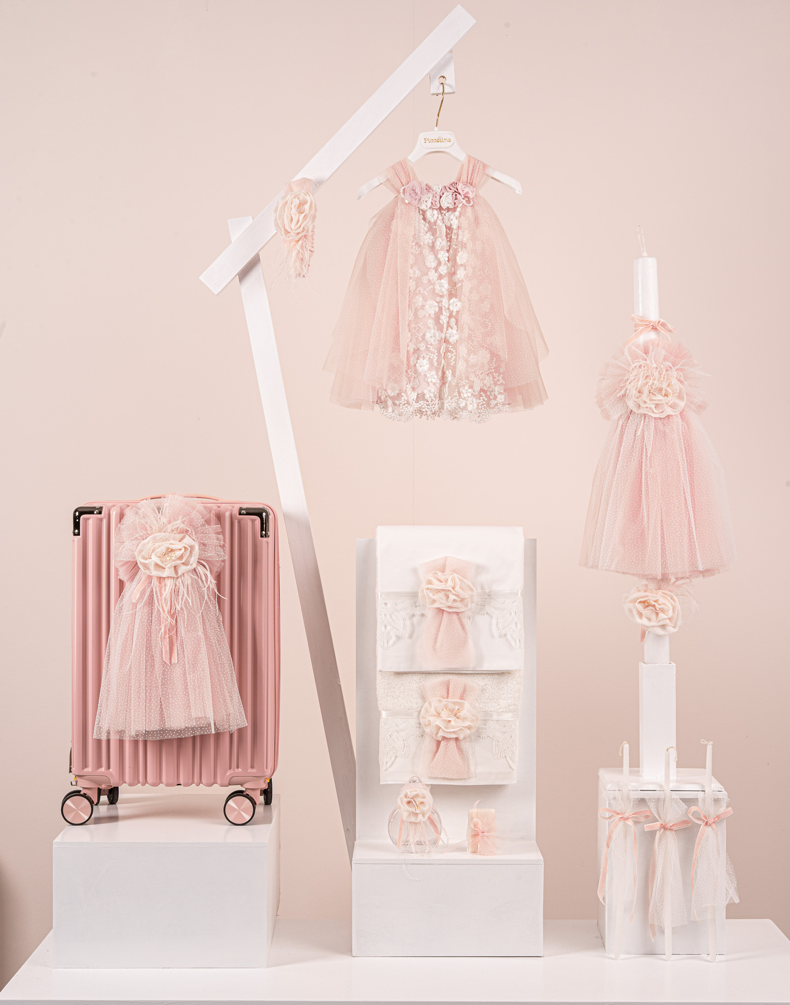 Βαπτιστικό πακέτο Premiere K2626 περιλαμβάνει φόρεμα ,σετ λαδόπανα, λαμπάδα, λαδοσετ και στολισμένη βαλίτσα pink