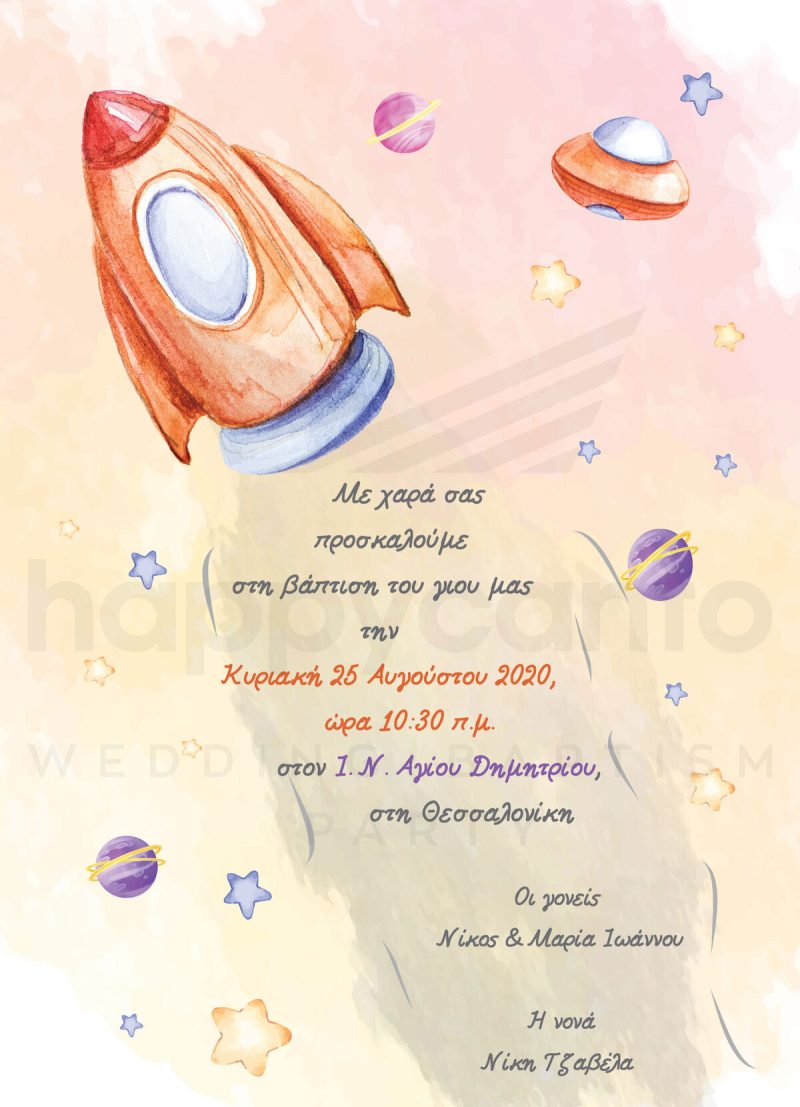 Προσκλητήριο βάπτισης για αγόρι ΑΒ13 με θέμα διάστημα, συνδυάζεται με μπεζ φάκελο.