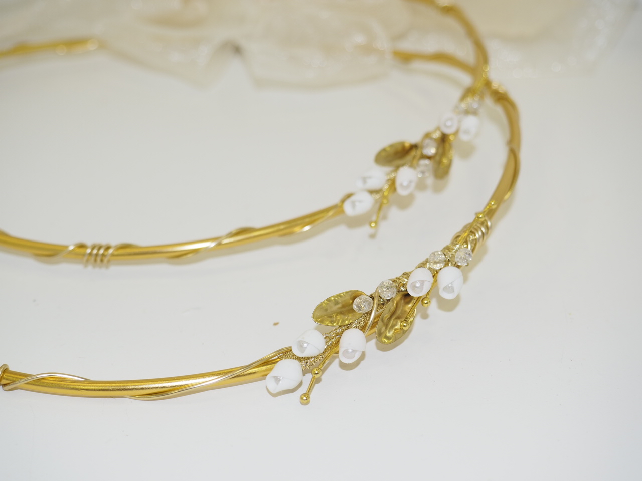 Επίχρυσα στέφανα γάμου, με βέργα σε χρυσή απόχρωση και στολισμό από επίχρυσα φύλλα ελιάς και πορσελάνινα λουλούδια.