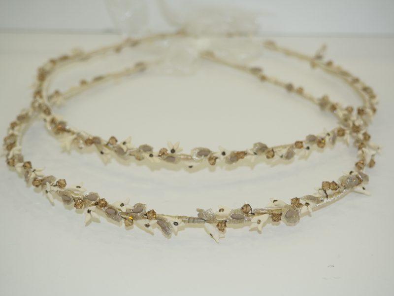 Χειροποίητα στέφανα γάμου, στολισμένα από χειροποίητα λουλούδια.