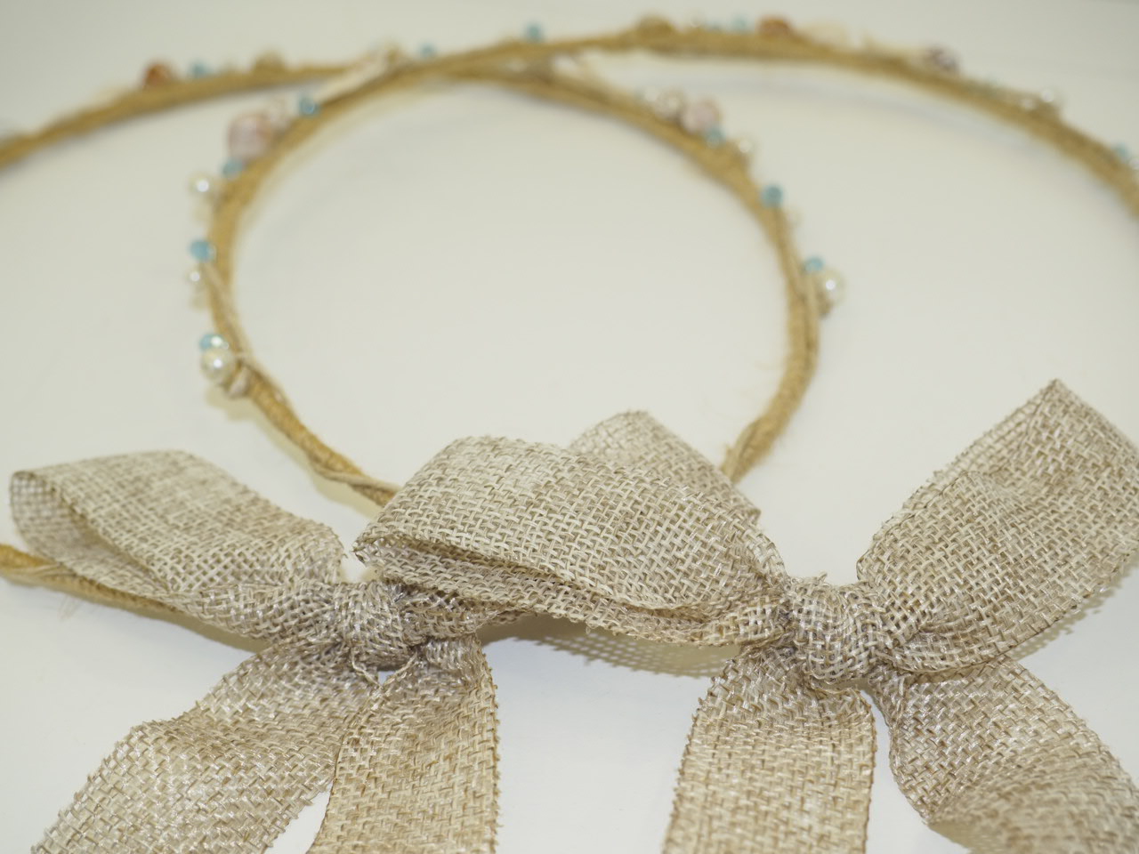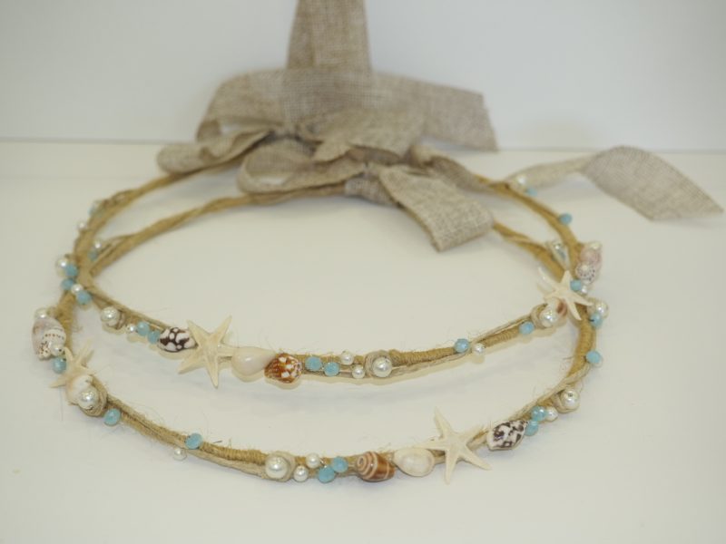 Χειροποίητα στέφανα γάμου, σε θαλασσινό ύφος στο χρώμα της άμμου, στολισμένα με αστερίες, κοχύλια και πέρλες σε εκρού και γαλάζιες αποχρώσεις. Όλα τα στέφανα συνοδεύονται από ένα ζευγάρι καρφίτσες για τον γαμπρό και τον κουμπάρο.