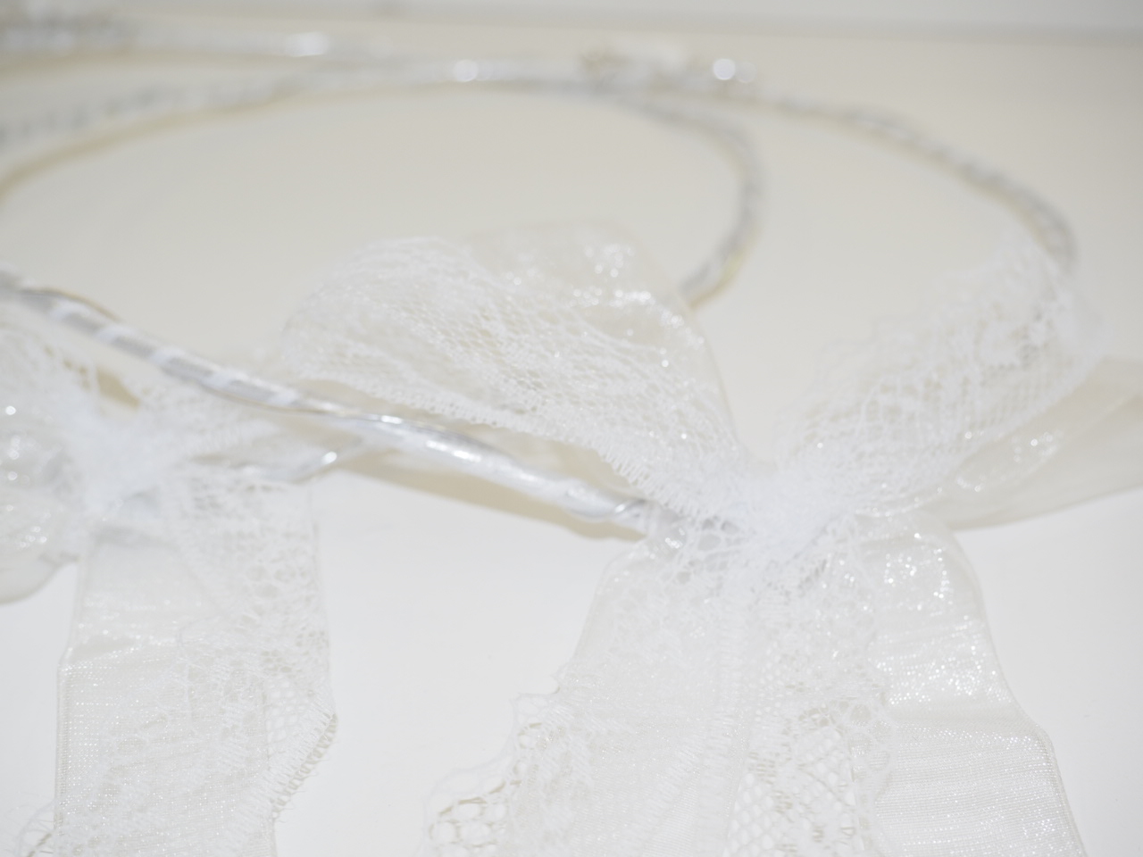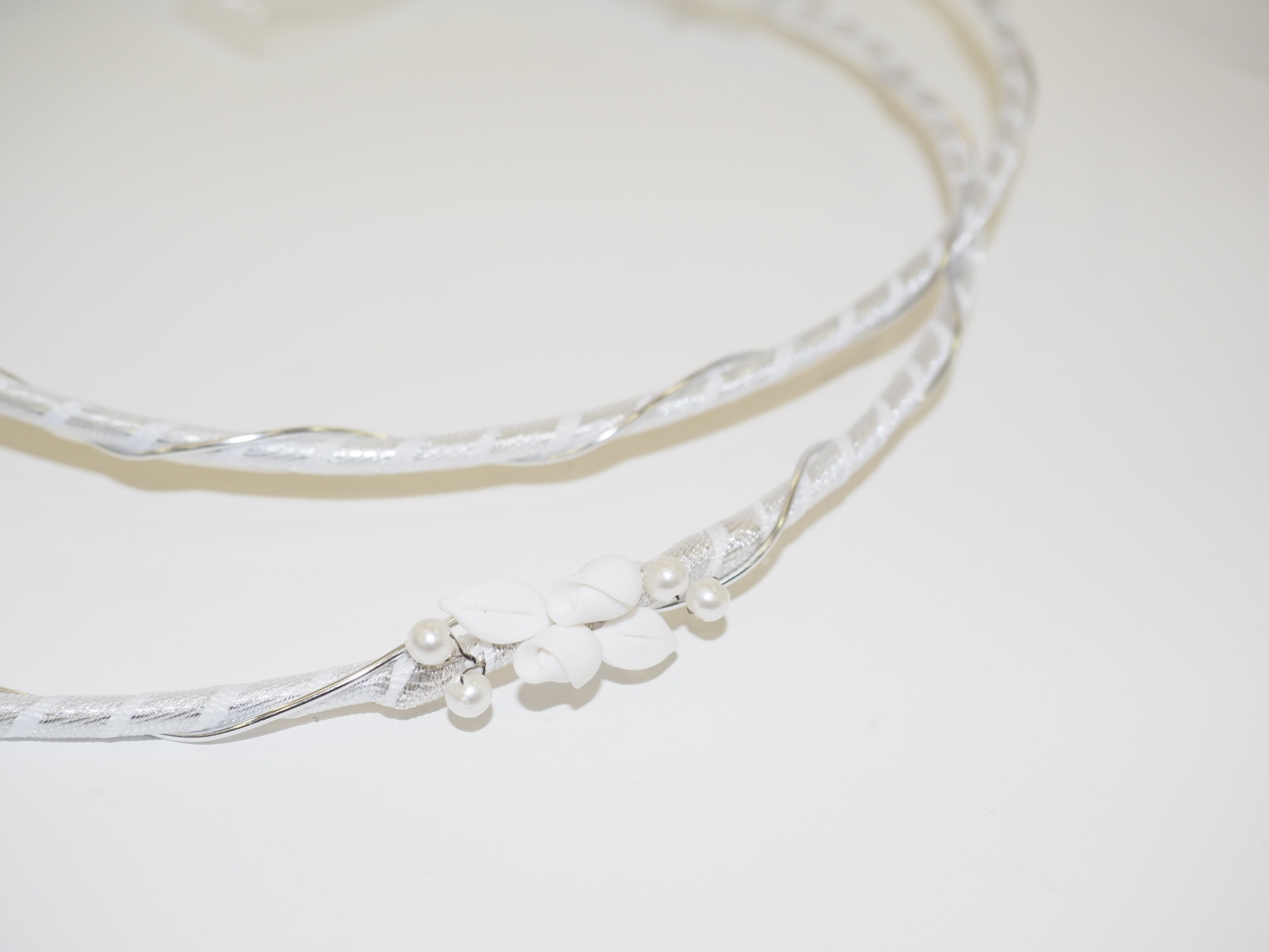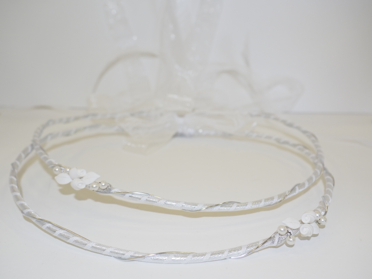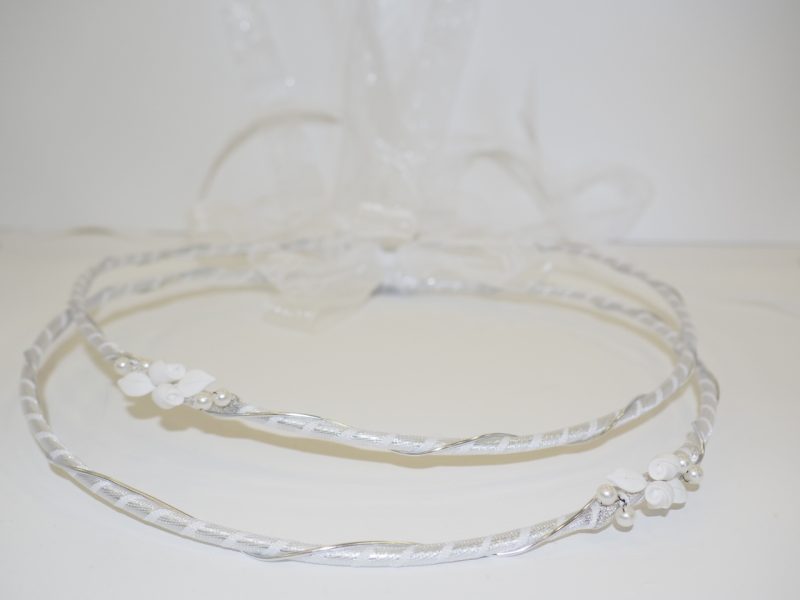 Χειροποίητα στέφανα γάμου, βέργα τυλιγμένη με κορδέλα ασημένιας και λευκής απόχρωσης, στολισμένα με πορσελάνινα λουλούδια και πέρλες.