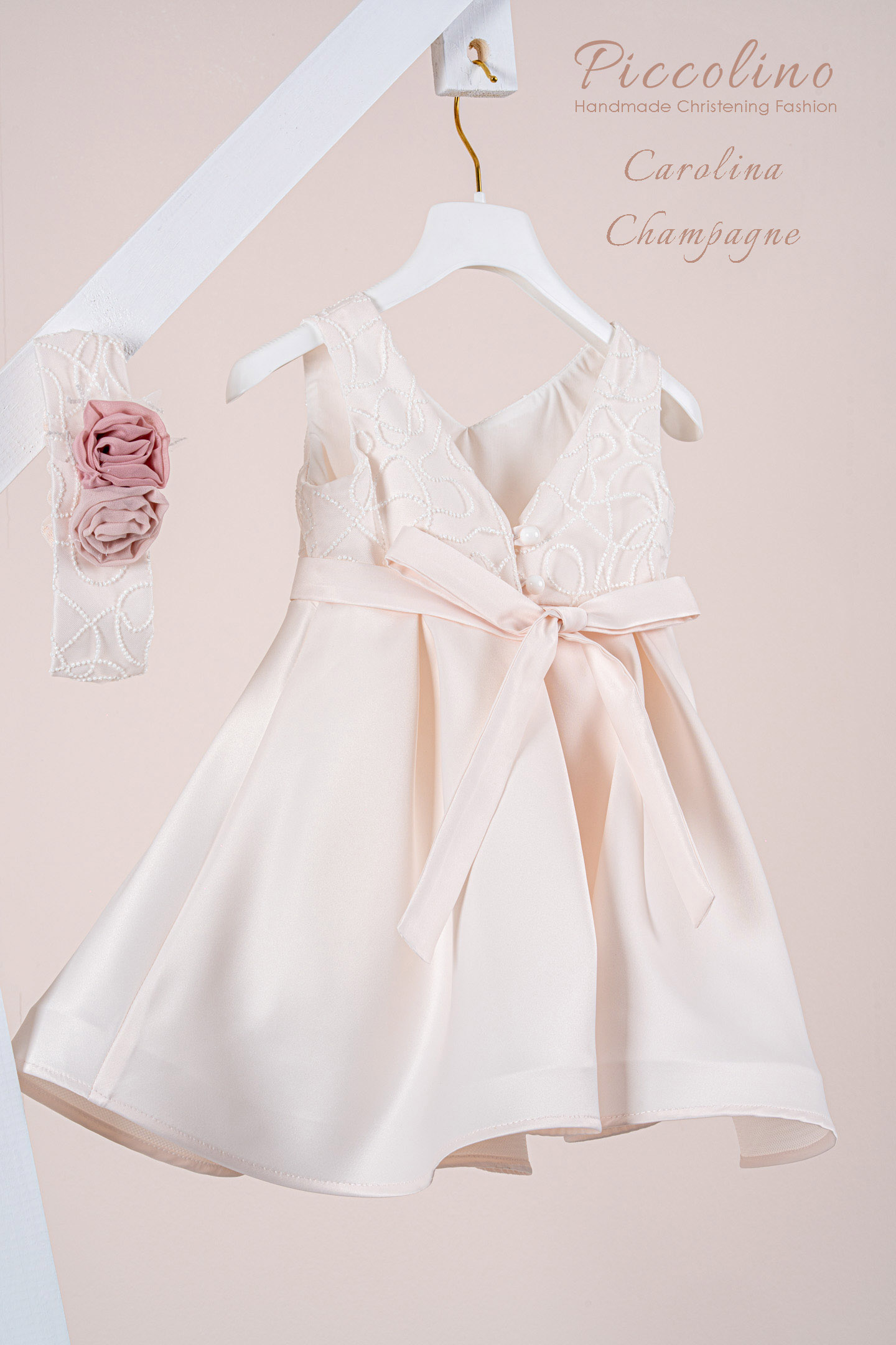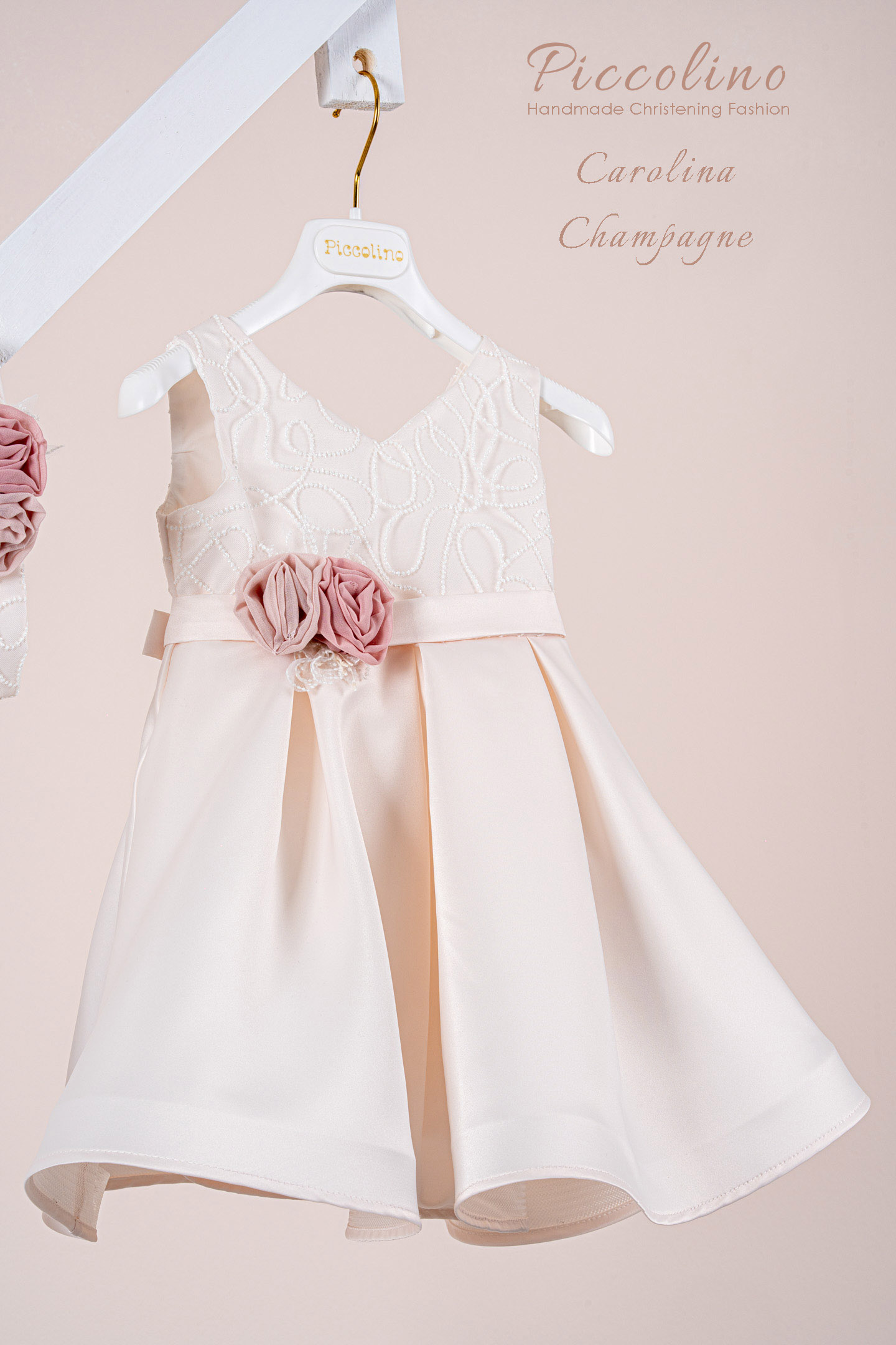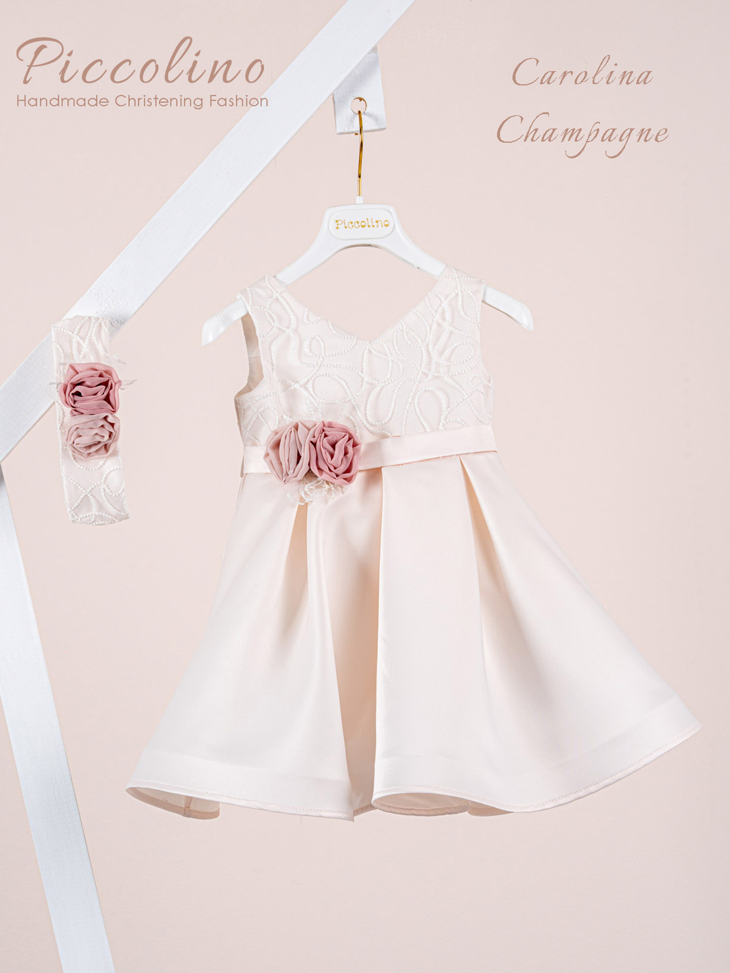 Βαπτιστικό φόρεμα Piccolino Carolina Champagne. Ένα εντυπωσιακό chic φόρεμα από σατέν ύφασμα. Μπούστο με λαιμόκοψη σε σχήμα καρδιάς και επίστρωση λαμπερής δαντέλας με γκλίτερ. Φούστα από σατέν ύφασμα που σχηματίζει πιέτες κάνοντας το φόρεμα μοναδικά ξεχωριστό. Το ντεκόρ του φορέματος αποτελείται από σατέν ζωνάκι και σύνθεση με χειροίητα λουλούδια. Το φόρεμα συνοδέυεται απο κορδέλα με ντεκόρ όμοιο με το φόρεμα. Διαθέσιμο σε 4 μεγέθη: 6-12, 12-18, 18-24, 24-36(εξτρά χρέωση).