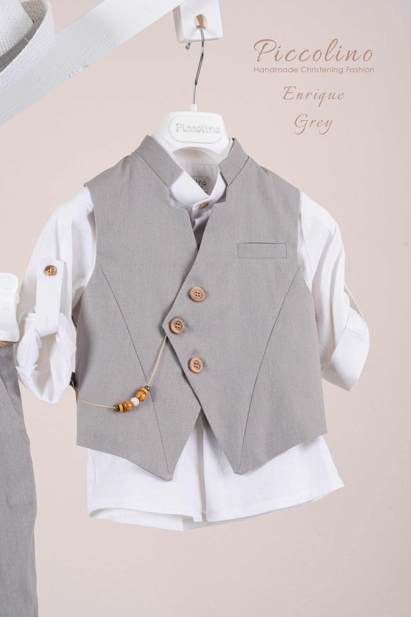 Βαπτιστικό κοστούμι Piccolino Enrique σε χρώμα Grey. Περιλαμβάνει λινό γιλέκο με μύτη ξύλινα κουμπιά και διακοσμητικό κρεμαστό με χάντρες, πουκάμισο λινό με γιακά μαο, παντελόνι λινό σε χρώμα Teal, ζωνάκι με double D δέσιμο και καπέλο με φάσα. Διαθέσιμο σε 4 μεγέθη 6-12, 12-18, 18-24, 24-36(εξτρά χρέωση)