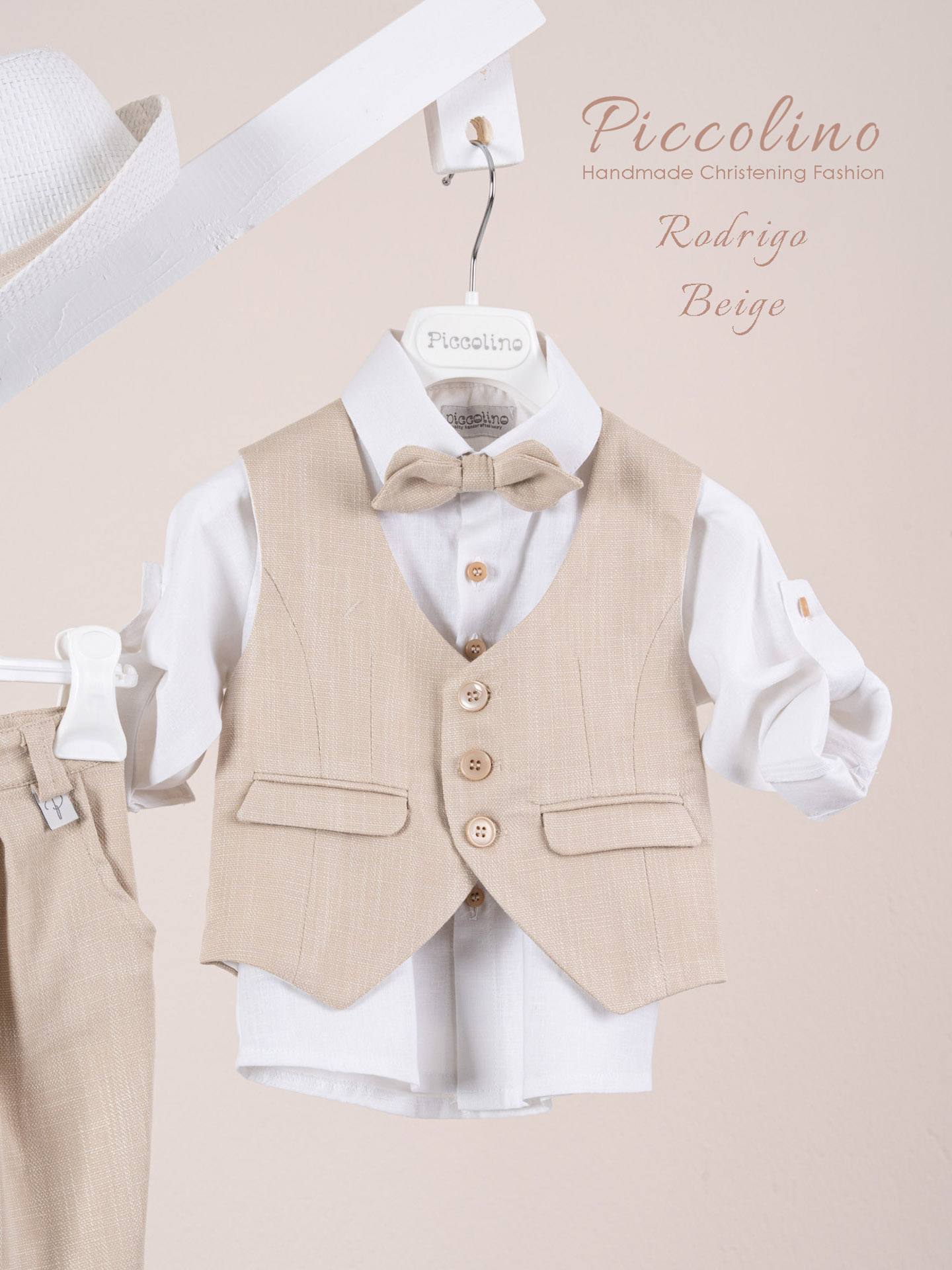 Βαπτιστικό κοστούμι Piccolino Rodrigo σε χρώμα Beige. Περιλαμβάνει κλασάτο γιλέκο, πουκάμισο λινό, παντελόνι σε χρώμα redwood με πιέτες, παπιγιόν διπλό με μύτες και καπέλο με φάσα. Διαθέσιμο σε 4 μεγέθη 6-12, 12-18, 18-24, 24-36(εξτρά χρέωση)