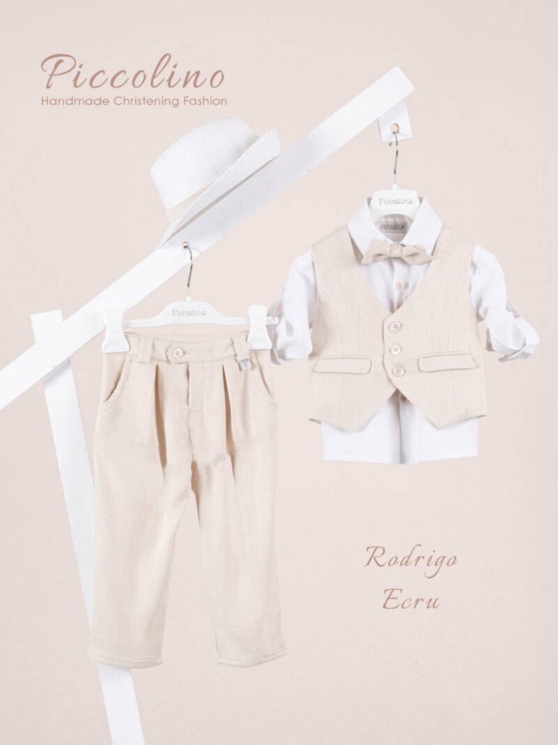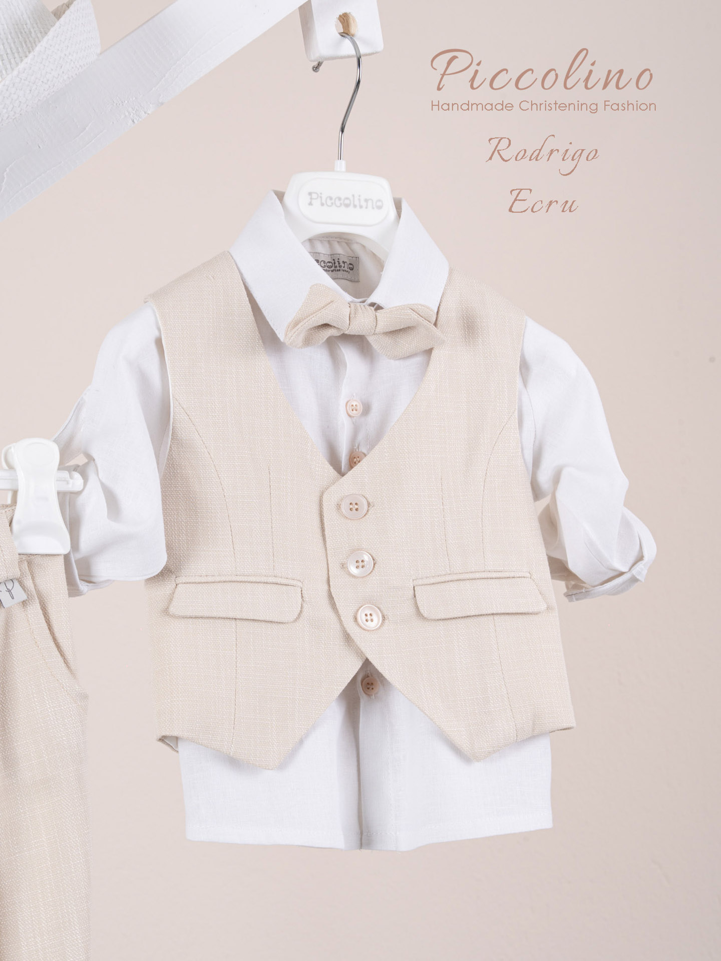 Βαπτιστικό κοστούμι Piccolino Rodrigo σε χρώμα Ecru. Περιλαμβάνει κλασάτο γιλέκο, πουκάμισο λινό, παντελόνι σε χρώμα redwood με πιέτες, παπιγιόν διπλό με μύτες και καπέλο με φάσα. Διαθέσιμο σε 4 μεγέθη 6-12, 12-18, 18-24, 24-36(εξτρά χρέωση)